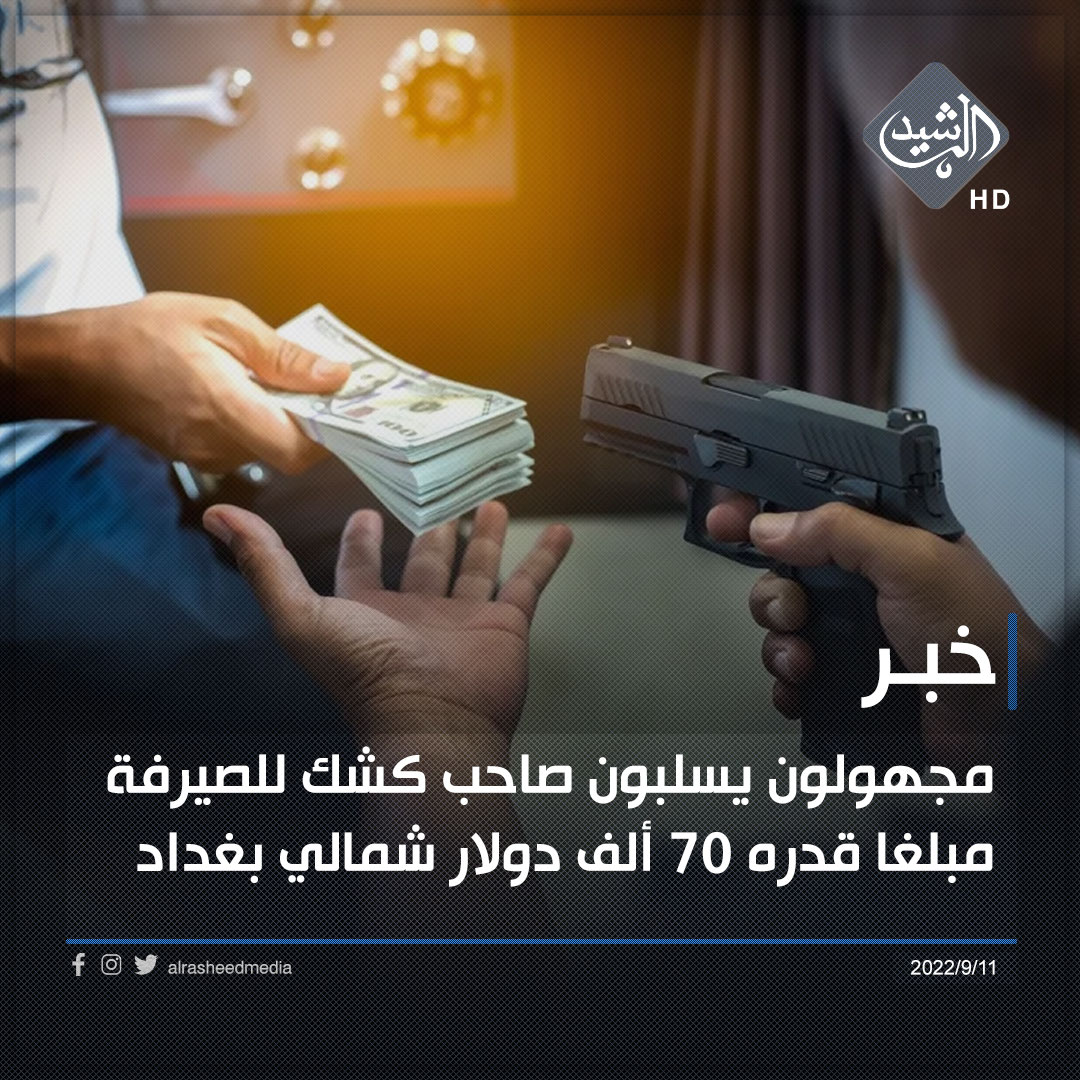 وقال المصدر في حديث للرشيد، أن”اربعة مسلحين مجهولين أقدموا على تسليب صاحب كشك للصيرفة مبلغ قدره 70 الف دولار امريكي و8 ملايين دينار عراقي بالقرب من داره ضمن منطقة حي البساتين في منطقة الشعب”.