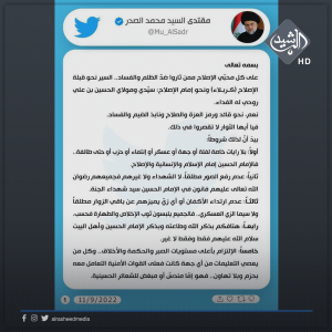 سياسةالسيد الصدر يدعو محبي الإصلاح السير نحو كربلاء ويضع عشرة شروط قبل 3 سنوات 3 مشاهدات شارك الصدر الوسومالصدرقد يهمك أيضا محليات اخماد حريق بناية تجارية في منطقة الاعظمية قبل 12 دقيقة 2 مشاهدات محليات اندلاع حريق داخل بناية متخذة كقاعة للاعراس في ساحة عنتر بمنطقة الاعظمية قبل ساعة واحدة 13 مشاهدات ثقافة وفن بعد مصرعها بحريق في منزلها.. مساعدة الفنانة "نيفين مندور" تزعم مقتلها وتطالب بالتحقيق قبل 3 ساعات 9 مشاهدات أمن احباط محاولة هروب سجين وسط العاصمة بغداد قبل 3 ساعات 10 مشاهدات أمن الاستخبارات العسكرية تطيح بـ18 متهماً بقضايا قانونية مختلفة في أربع محافظات قبل 4 ساعات 9 مشاهدات