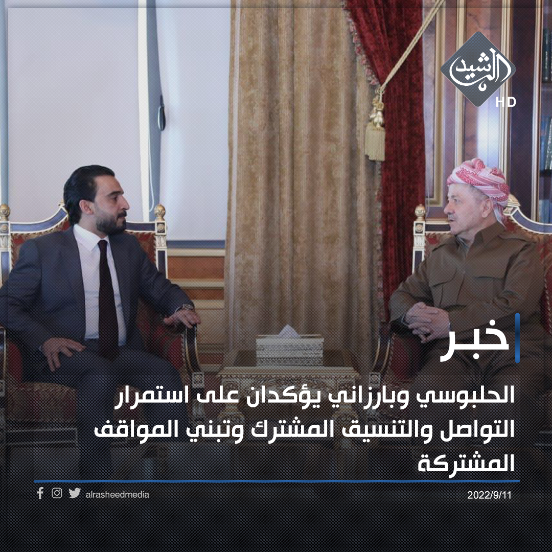 وذكر بيان لمكتب الحلبوسي تلقته الرشيد، أن”رئيس مجلس النواب محمد الحلبوسي، التقى رئيسَ الحزب الديمقراطي الكردستاني مسعود بارزاني واستعرض الجانبان، خلال اللقاء، الوضع السياسي في العراق، وتداعياته السلبية على البلاد، وضرورة اعتماد لغة الحوار البنَّاء؛ لتجاوز الخلافات والوصول إلى حلول تصبُّ في مصلحة الشعب العراقي، واتباع الأساليب الدستورية والقانونية في تجاوز تداعيات المرحلة الراهنة”.