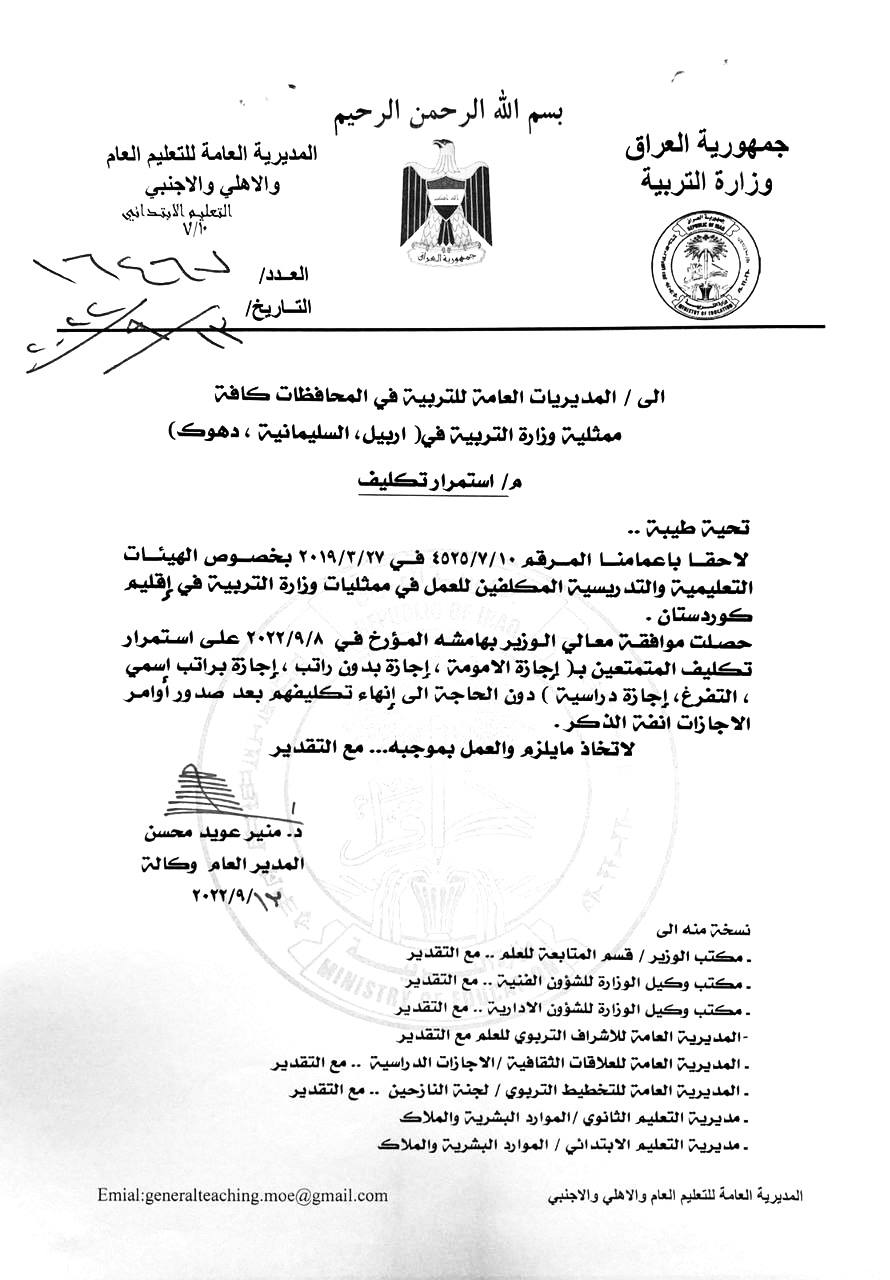 وأوضح، ان “القرار ينص على موافقة معالي وزير التربية علي حميد الدليمي، باستمرار تكليف المتمتعين من الهيئات التعليمية والتدريسية بـ(إجازة الأمومة، إجازة بدون راتب، إجازة براتب اسمي، التفرغ، إجازة دراسية) للعمل في ممثليات وزارة التربية في إقليم كردستان، من دون الحاجة إلى إنهاء تكليفهم بعد صدور أوامر الإجازات آنفة الذكر” .