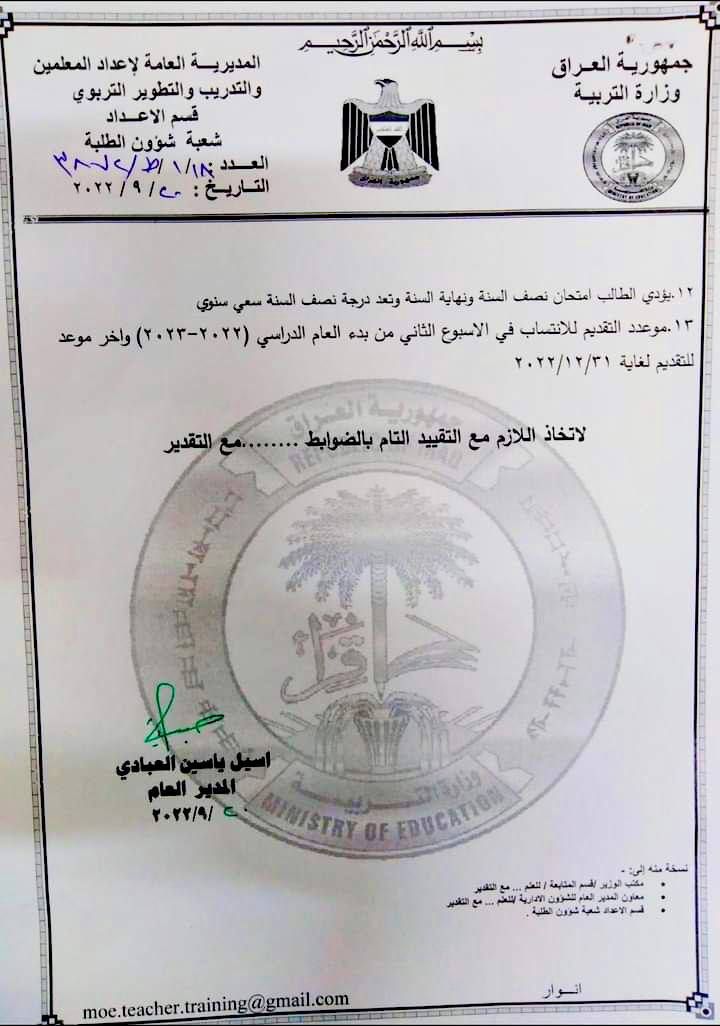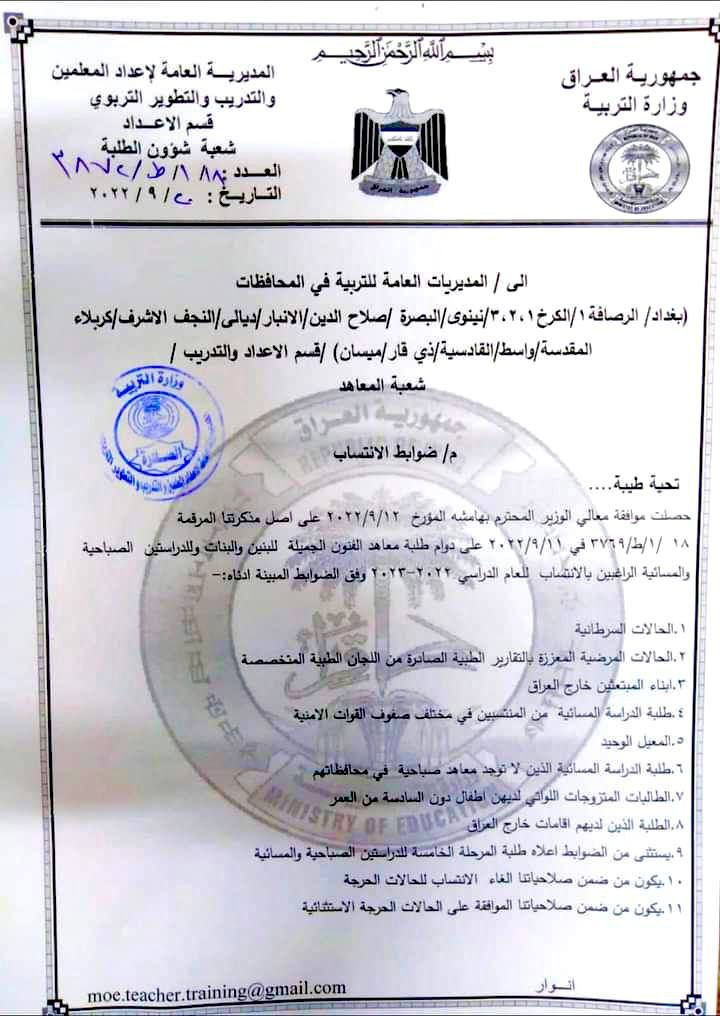 محلياتالتربية تعلن ضوابط الانتساب الخاصة بطلبة معاهد الفنون الجميلة (وثيقة) قبل 3 سنوات 8 مشاهدات شارك الوسوموزارة التربية العراقيةقد يهمك أيضا عربي ودولي تحذير مصري قطري تركي عاجل قبل انهيار هدنة غزة قبل 3 دقائق أمن الداخلية تعلن خلو العراق من أي مصانع للمخدرات أو محاولات لزراعتها قبل 46 دقيقة 4 مشاهدات سياسة السوداني ووفد الديمقراطي يؤكدان أهمية الإسراع بإنجاز الاستحقاقات الدستورية قبل ساعتين 5 مشاهدات محليات الأنواء الجوية: ضباب كثيف وانعدام الرؤية فجر وصباح غدٍ الأربعاء في الوسط والجنوب قبل ساعتين 4 مشاهدات سياسة "الرشيد" تنشر نص قرارات مجلس الوزراء في جلسة اليوم قبل 3 ساعات 15 مشاهدات