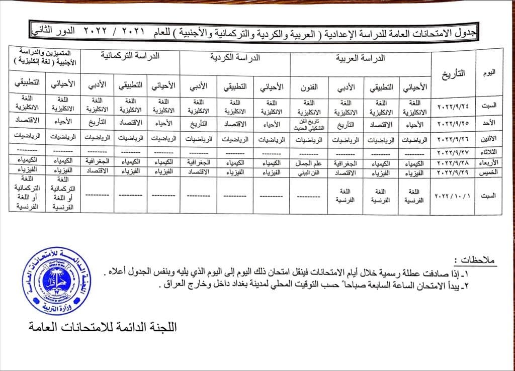وذكرت الوزارة في بيان تلقته الرشيد، أنه”تقرر إجراء تعديلاً في جدول الامتحانات العامة لطلبة السادس الإعدادي الدور الثاني بفروعه كافة العلمي ( الأحيائي ، التطبيقي ) ، الأدبي / للعام الدراسي (2021-2022)،بإعطاء يوم الثلاثاء استراحة للطلبة”.