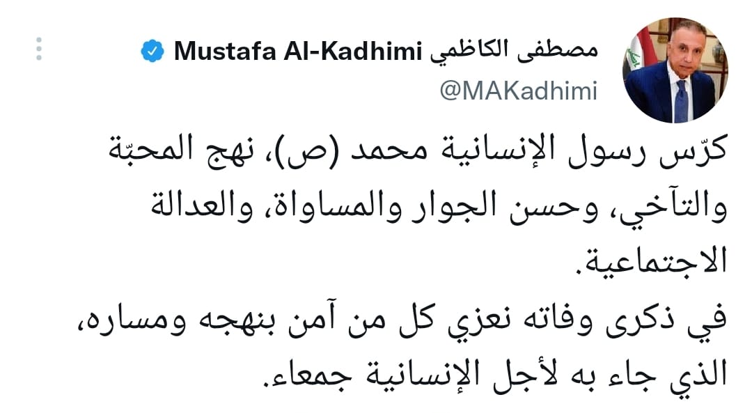 قدم رئيس مجلس الوزراء مصطفى الكاظمي، السبت، التعزية بوفاة الرسول (ص).
