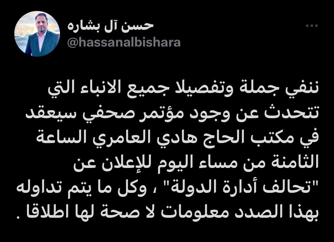 وذكر آل بشارة، في تغريدة على تويتر تابعتها “الرشيد”، “ننفي جملةً وتفصيلاً جميع الانباء التي تتحدث عن وجود مؤتمر صحفي سيعقد في مكتب الحاج هادي العامري الساعة الثامنة من مساء اليوم للإعلان عن “تحالف أدارة الدولة”.