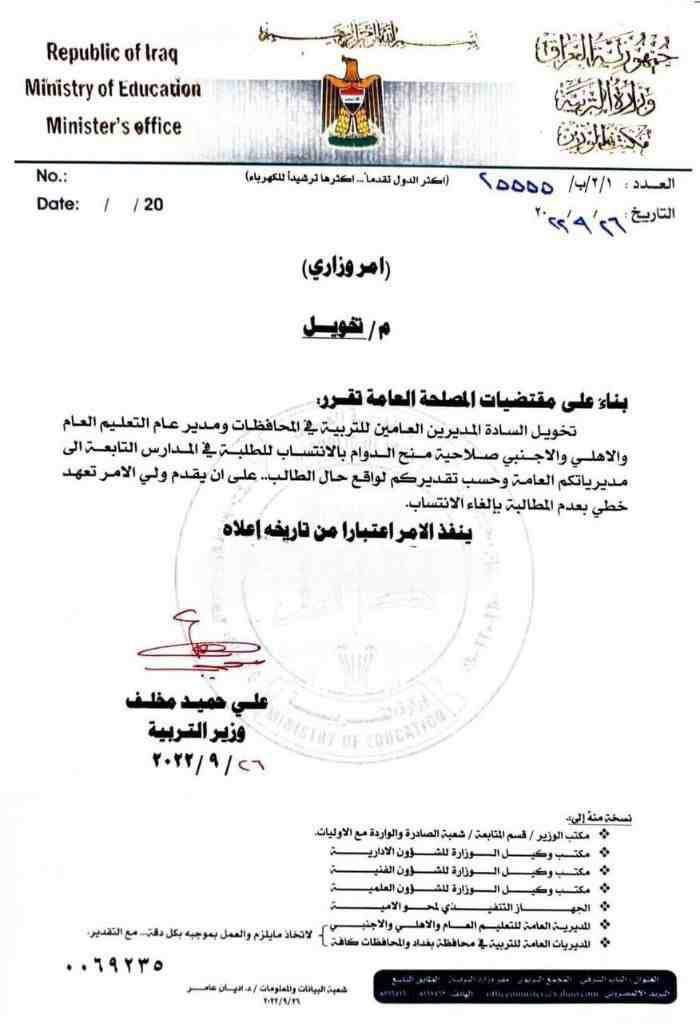 محلياتبالوثيقة.. وزير التربية يخول مدراء التربية في المحافظات بصلاحية منح الدوام للطلبة بالتنسيب قبل 3 سنوات 14 مشاهدات شارك الوسوموزارة التربية العراقيةقد يهمك أيضا عربي ودولي تحذير مصري قطري تركي عاجل قبل انهيار هدنة غزة قبل 3 دقائق أمن الداخلية تعلن خلو العراق من أي مصانع للمخدرات أو محاولات لزراعتها قبل 46 دقيقة 4 مشاهدات سياسة السوداني ووفد الديمقراطي يؤكدان أهمية الإسراع بإنجاز الاستحقاقات الدستورية قبل ساعتين 5 مشاهدات محليات الأنواء الجوية: ضباب كثيف وانعدام الرؤية فجر وصباح غدٍ الأربعاء في الوسط والجنوب قبل ساعتين 4 مشاهدات سياسة "الرشيد" تنشر نص قرارات مجلس الوزراء في جلسة اليوم قبل 3 ساعات 15 مشاهدات