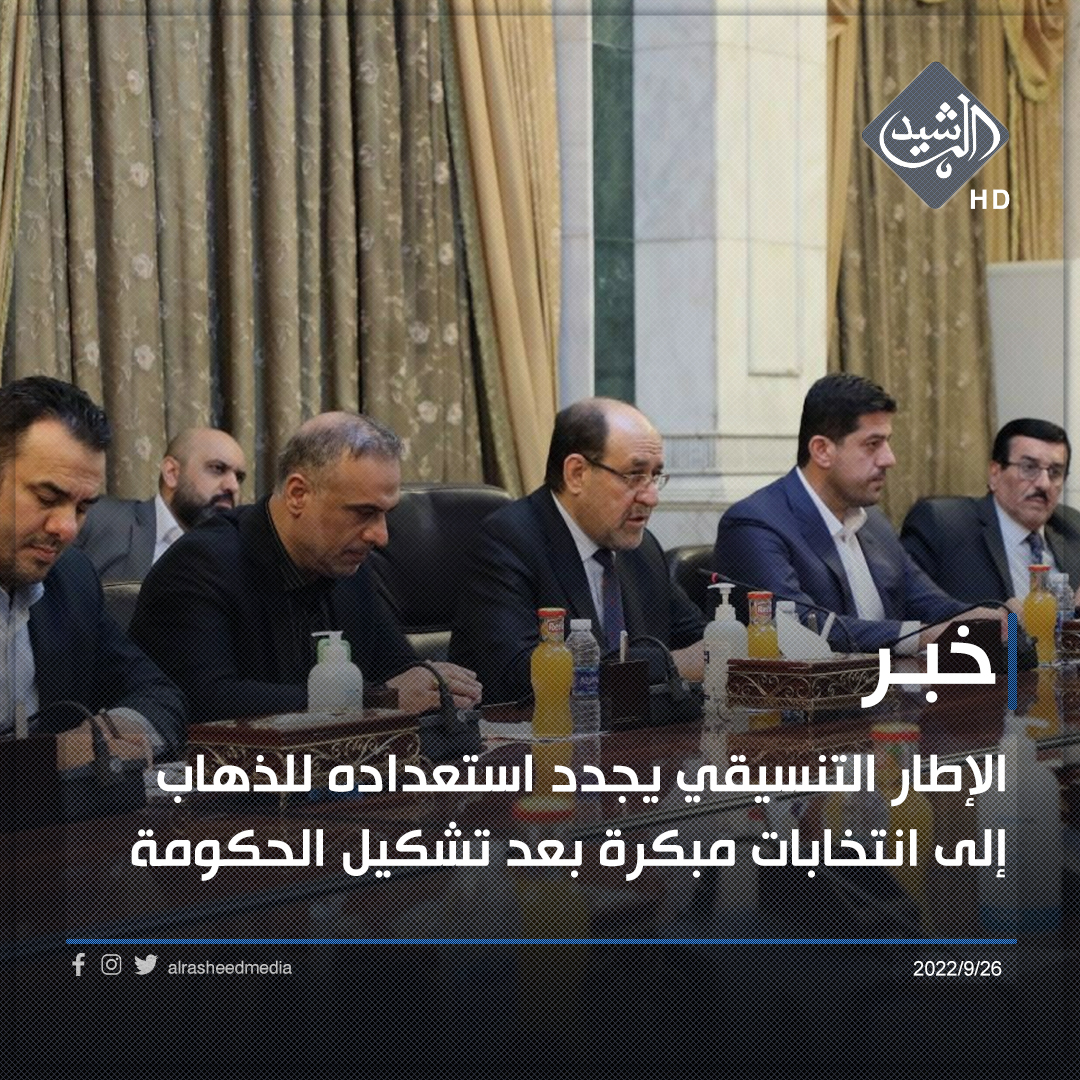 وذكر بيان للاطار تلقته “الرشيد”، ان “الاطار التنسيقي عقد اجتماعه الاعتيادي اليوم الاثنين ٢٦-٩-٢٠٢٢، وناقش الاطار التنسيقي اخر مستجدات الوضع السياسي في العراق واستحقاقات المرحلة المقبلة”.
