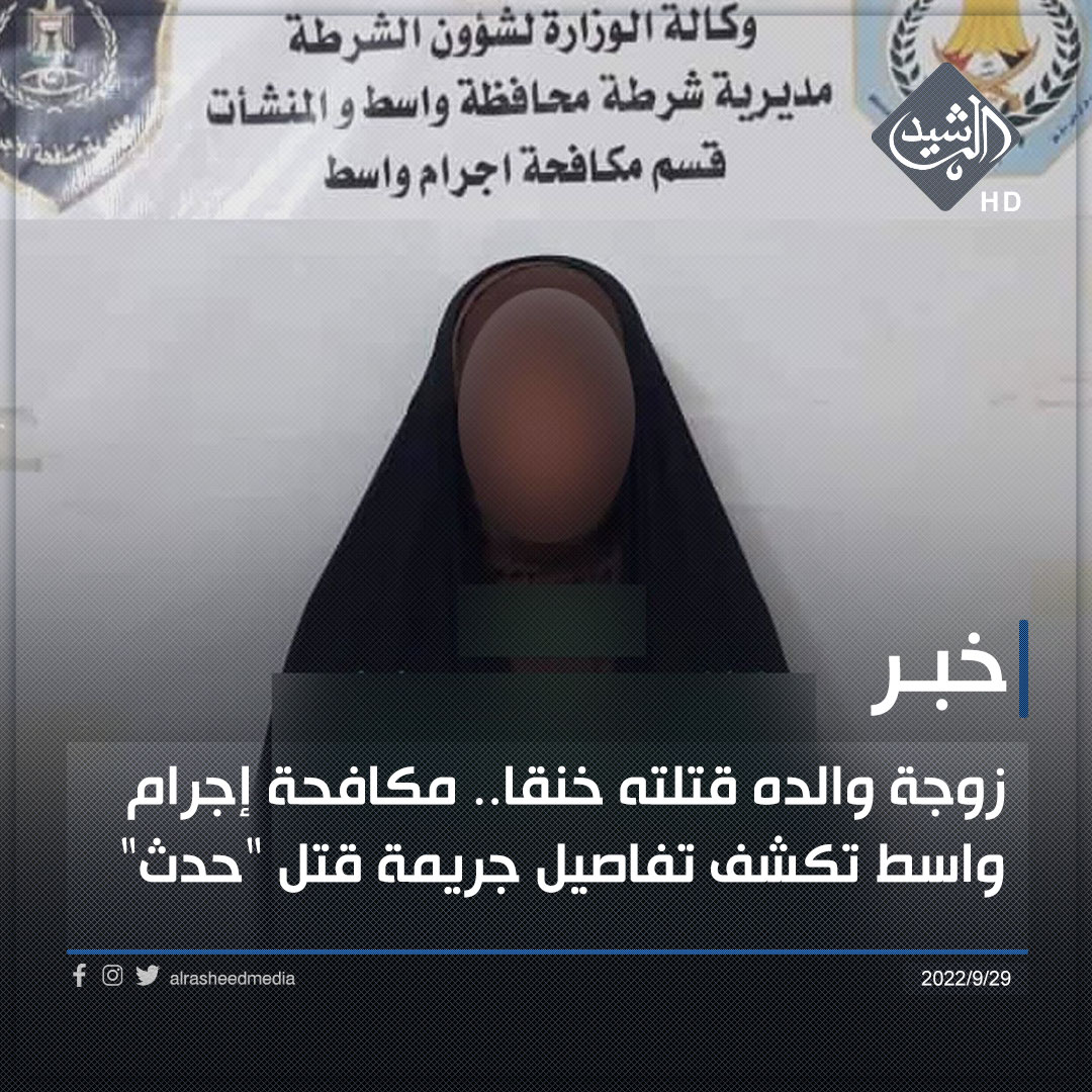 وذكرت المديرية في بيان تلقته الرشيد، أنه”بجهود امنية حثيثة وعمل متواصل مكافحة إجرام واسط تكشف جريمة قتل غامضة ، حيث قامت المتهمة (ك . م . ط ) بقتل المجنى عليه الحدث ابن زوجها بعد أن قامت بقتله (خنق) اثر خلاف عائلي مع زوجها . اجري كشف الدلالة وجاء مطابقاً للحقيقة وتم تجريمها وفق أحكام المادة ٤٠٦ قتل عمد”.