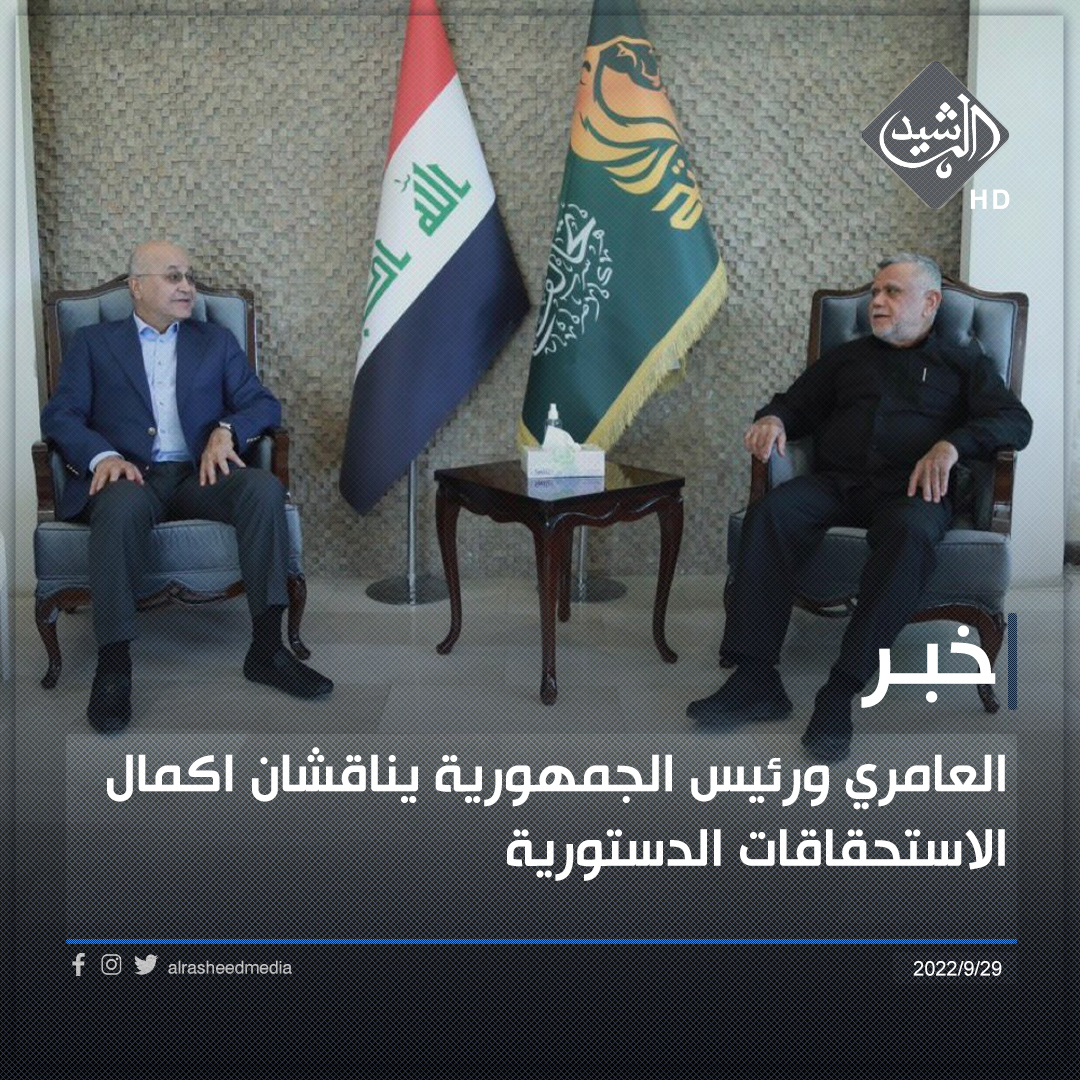 بحث رئيس تحالف الفتح هادي العامري، مع رئيس الجمهورية برهم صالح، اكمال الاستحقاقات الدستورية وإنهاء الأزمة السياسية