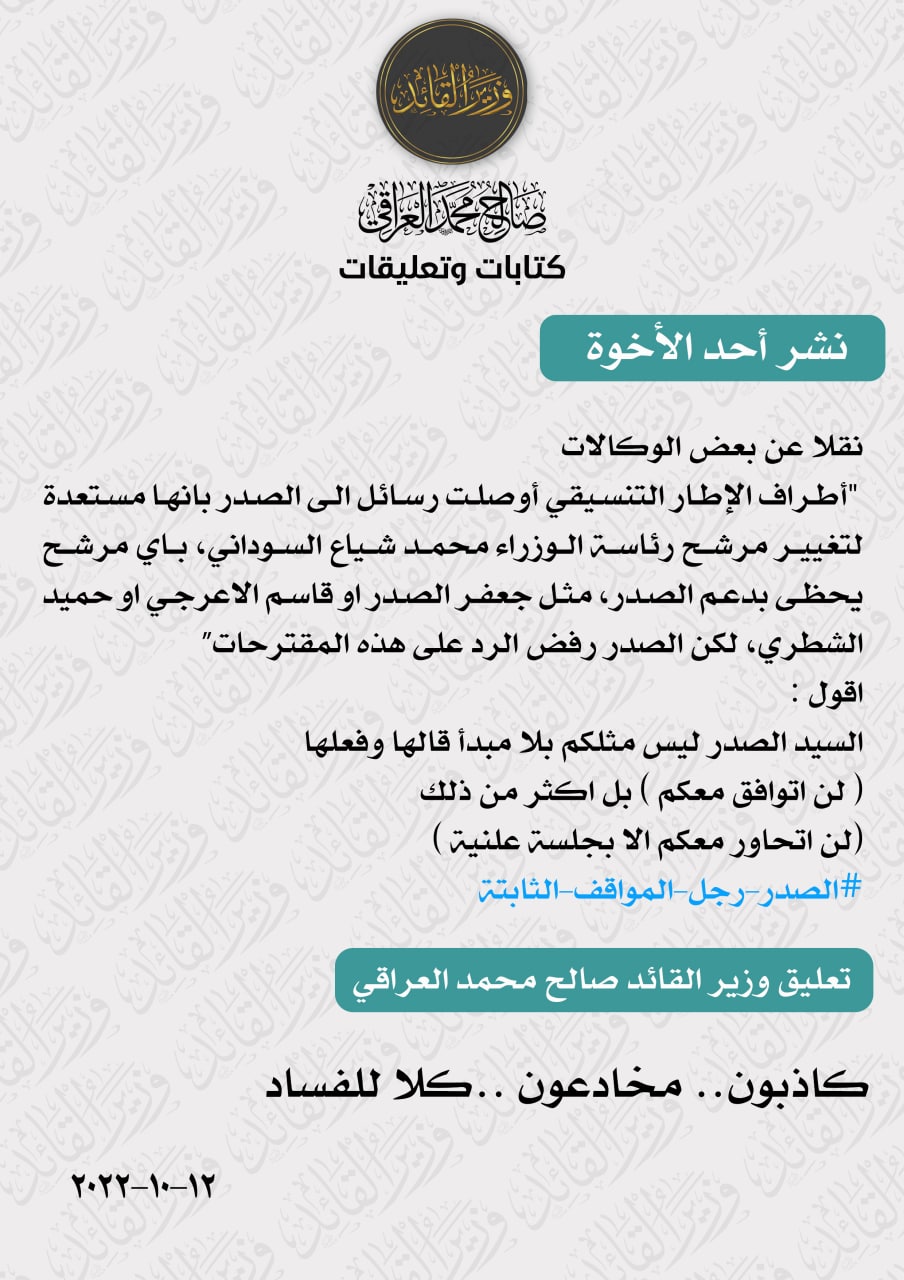 سياسةوزير السيد الصدر ينفي وصول رسائل من الاطار التنسيقي بشأن تغيير السوداني قبل 3 سنوات 1 مشاهدة شارك الوسومالصدرقد يهمك أيضا أقتصاد الدولار يغلق على انخفاض في الاسواق المحلية قبل 44 دقيقة 4 مشاهدات أقتصاد وزير التجارة: أكثر من 4 ملايين اسم وهمي ومتكرر ومسافر بملف البطاقة التموينية قبل ساعة واحدة 6 مشاهدات محليات اخماد حريق بناية تجارية في منطقة الاعظمية قبل ساعتين 8 مشاهدات محليات اندلاع حريق داخل بناية متخذة كقاعة للاعراس في ساحة عنتر بمنطقة الاعظمية قبل 3 ساعات 14 مشاهدات ثقافة وفن بعد مصرعها بحريق في منزلها.. مساعدة الفنانة "نيفين مندور" تزعم مقتلها وتطالب بالتحقيق قبل 4 ساعات 10 مشاهدات