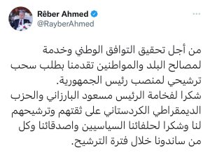 وأشار إلى، أنه”بعدما باءت كل المحاولات التي حاولت عدم مراعاة الاجماع الكُردي بالفشل وانطلاقا من ثوابتنا الوطنية الراسخة في الحزب الديمقراطي الكردستاني ولاجل نجاح عملية انتخاب رئيس الجمهورية وتأسيس التشكيلة الوزارية الجديدة في الحكومة العراقية الاتحادية قررنا سحب مرشحنا ( ريبر أحمد ) لتولي منصب رئيس الجمهورية مع تمنياتنا بالنجاح والتوفيق لجلسة مجلس النواب وسعيهم لانتخاب رئيس الجمهورية”.
