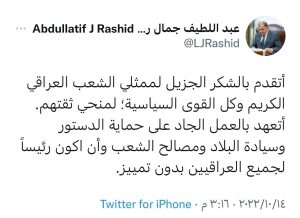 أتقدم بالشكر الجزيل لممثلي الشعب العراقي الكريم وكل القوى السياسية؛ لمنحي ثقتهم. أتعهد بالعمل الجاد على حماية الدستور وسيادة البلاد ومصالح الشعب وأن اكون رئيساً لجميع العراقيين بدون تمييز.