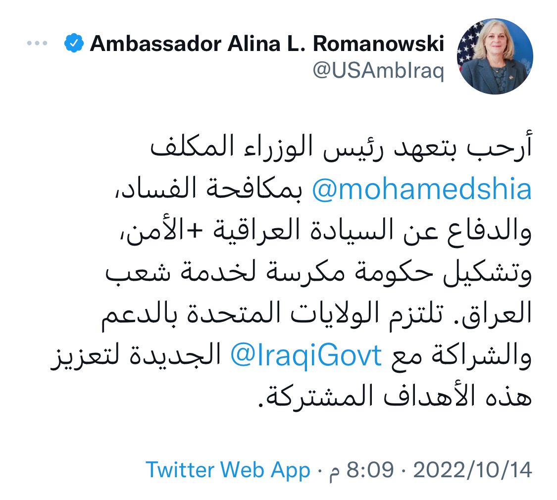 سياسةالسفيرة الامريكية: الولايات المتحدة ملتزمة بالدعم والشراكة مع الحكومة العراقية الجديدة قبل 3 سنوات 5 مشاهدات شارك الوسومالسفارة الامريكية في بغدادمحمد شياع السودانيقد يهمك أيضا أمن العراق يعلن إنشاء "بنك معلومات وطني" للأسلحة قبل 9 دقائق 2 مشاهدات عربي ودولي قيود وضوابط جديدة.. اليابان تشدد سياسات الهجرة رغم شيخوخة السكان قبل 13 دقيقة 4 مشاهدات محليات العراق يستعد لاستقبال حالة جوية غير مستقرة وأمطار غزيرة اعتباراً من مساء الغد قبل 42 دقيقة 3 مشاهدات عربي ودولي ألمانيا: سيتعين على أوروبا الحوار مع روسيا "في مرحلة ما" قبل 57 دقيقة 5 مشاهدات عربي ودولي الجمعية العامة للأمم المتحدة تعتمد قرارا يجدد ولاية وكالة الأونروا 3 سنوات قبل ساعة واحدة 14 مشاهدات