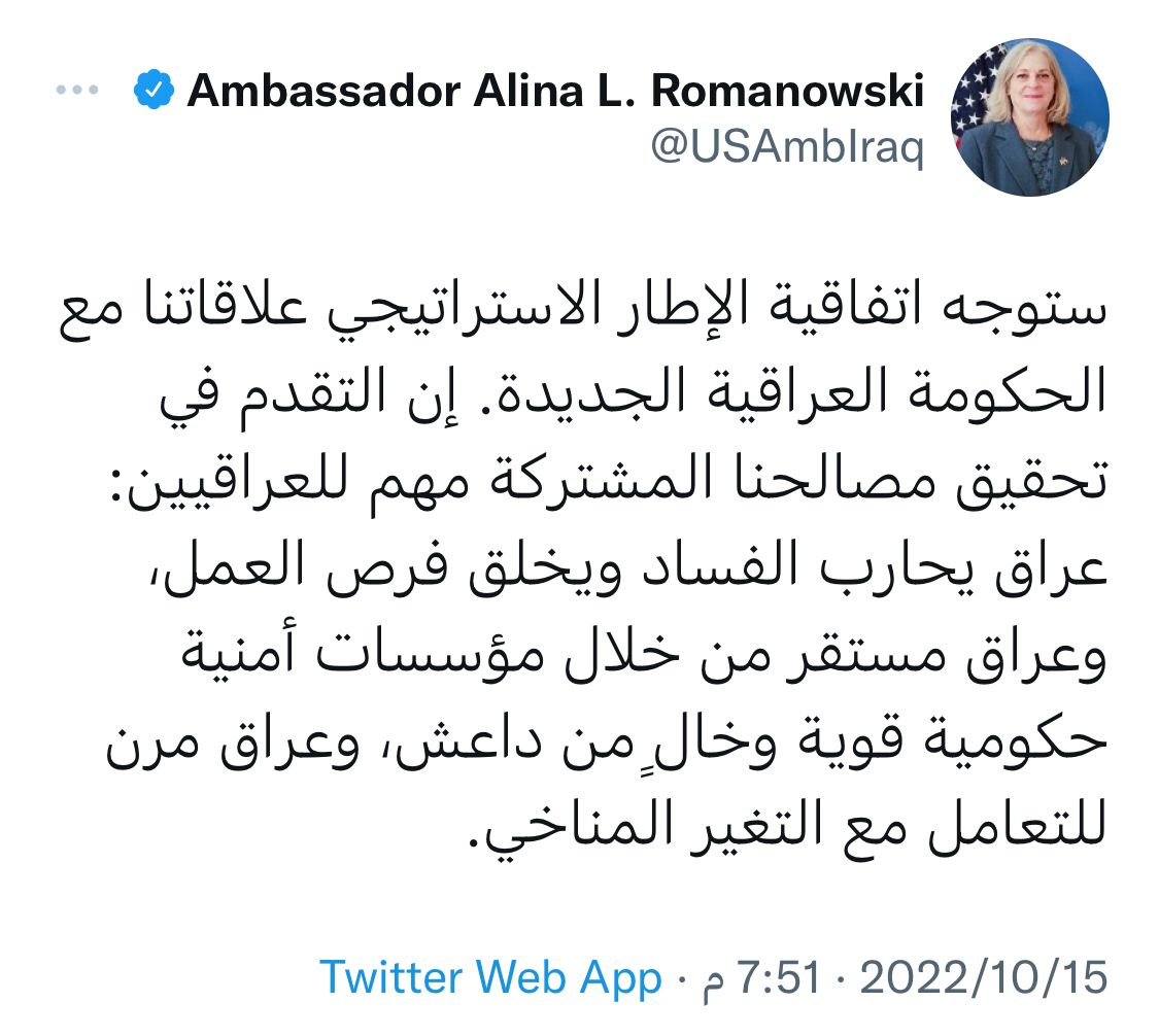 سياسةالسفيرة الامريكية: ستوجه اتفاقية الإطار الاستراتيجي علاقاتنا مع الحكومة العراقية الجديدة قبل 3 سنوات 3 مشاهدات شارك الوسومالسفارة الامريكية في بغدادقد يهمك أيضا أقتصاد برنت عند 61 دولاراً.. ارتفاع أسعار النفط بعد هجمات أوكرانية على روسيا وحصار أمريكي لفنزويلا قبل 5 دقائق 2 مشاهدات سياسة مبعوث ترامب: نزع السلاح يجب أن يكون شاملاً وغير قابل للتراجع وبيانات النوايا وحدها لا تكفي قبل 14 دقيقة 7 مشاهدات سياسة العراق وباكستان يناقشان الارتقاء بواقع التبادل التجاري والسجناء والعمالة قبل 9 ساعات 12 مشاهدات مع ياسر عامر الفصائل تنزع سلاحها و”النجباء والكتائب” يرفضون!! قبل 10 ساعات 13 مشاهدات سياسة المجلس السياسي الوطني يقرر عقد اجتماع الثلاثاء المقبل لمواصلة النقاشات قبل 10 ساعات 18 مشاهدات