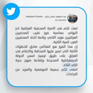 محلياترئيس الجمهورية يهنئ الاسرة الصحفية العراقية بفوز مؤيد اللامي برئاسة اتحاد الصحفيين العرب قبل 3 سنوات 1 مشاهدة شارك الوسوماتحاد الصحفيين العربالاسرة الصحفية العراقيةرئيس الجمهوريةمؤيد اللاميقد يهمك أيضا عربي ودولي النيران تتصاعد من ميناء تيمريوك الروسي بعد هجوم أوكراني بالمسيرات قبل 19 دقيقة 4 مشاهدات سياسة رئاسة الجمهورية تنفي علمها أو مصادقتها على قرار "اعتبار أنصار الله وحزب الله اللبناني" جماعات إرهابية قبل 36 دقيقة 6 مشاهدات عربي ودولي موسكو: قد يتم عقد لقاء بين بوتين وترامب في القريب العاجل قبل ساعة واحدة 6 مشاهدات رياضة "توالي الأزمات".. ليفربول يوجه ضربة قوية لمحمد صلاح ويقرر بيعه قبل ساعتين 9 مشاهدات عربي ودولي الرئيس اللبناني يطالب مجلس الأمن بالضغط على إسرائيل لتطبيق وقف إطلاق النار قبل ساعتين 8 مشاهدات