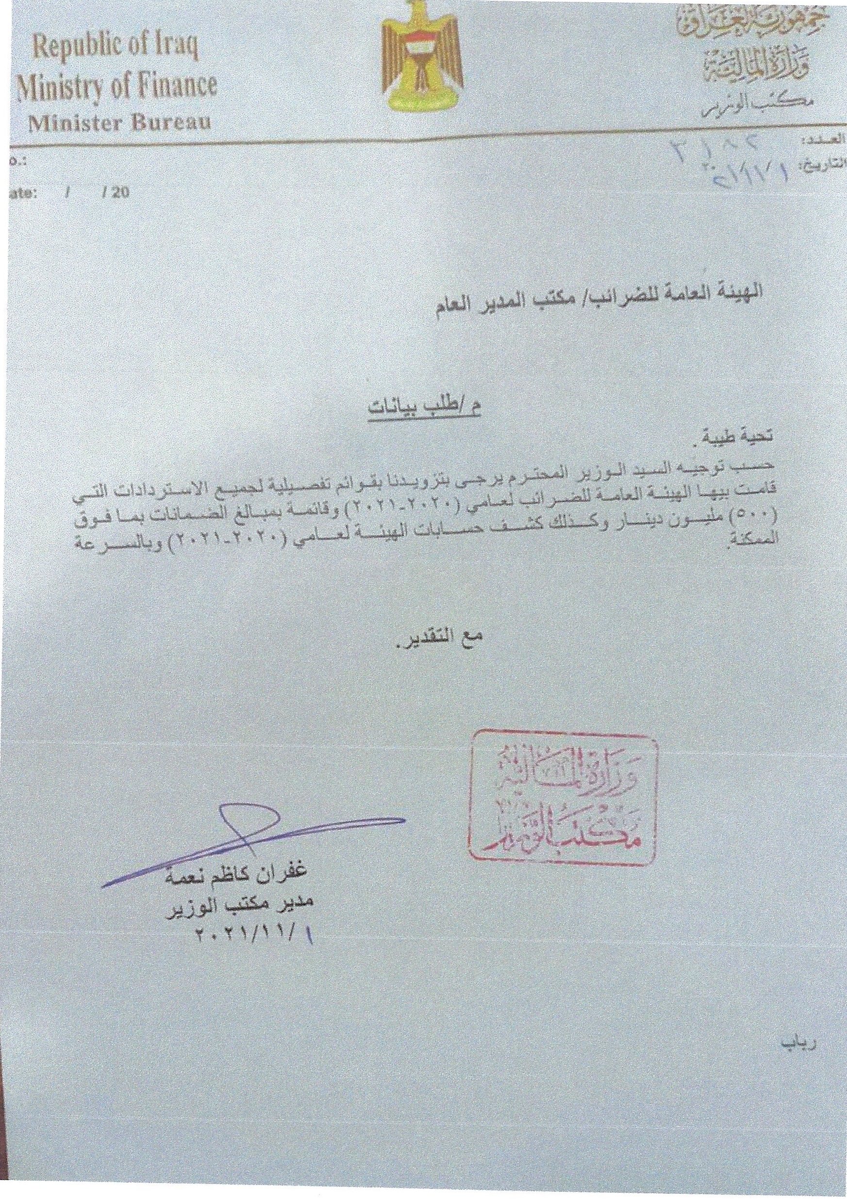 سابعا: ورغم اعلاه عندما وردت الى مكتب الوزیر مؤشرات تثیر الشك باستمرار عملیات التلاعب بما یتعلق باسترداد الامانات الضریبة خاطب وزیر المالیة في ١ تشرین الثاني ٢٠٢١ الھیئة العامة للضرائب بطلب اولیات جمیع معاملات استرداد الامانات التي تمت خلال عامي ٢٠٢٠ و٢٠٢١.