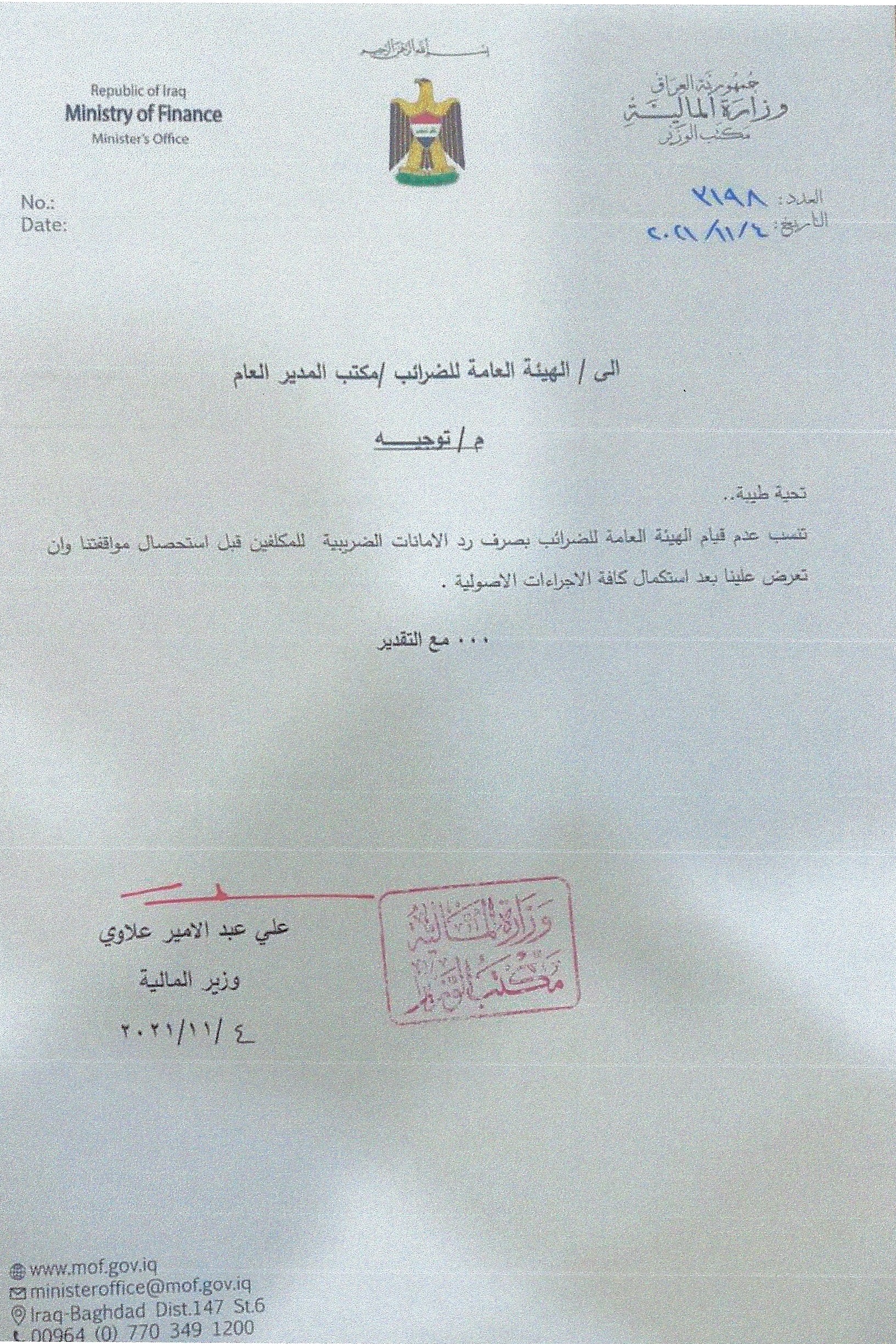ثامنا: وللتأكید على منع التلاعب نسب وزیر المالیة في ٤ تشرین الثاني ٢٠٢١ على عدم قیام الھیئة العامة للضرائب بصرف رد امانات للمكلفین قبل استحصال موافقة الوزیر وعلى ان تعرض جمیع معاملات استرداد الامانات على الوزیر بعد استكمال كافة الاجراءات الاصولیة.