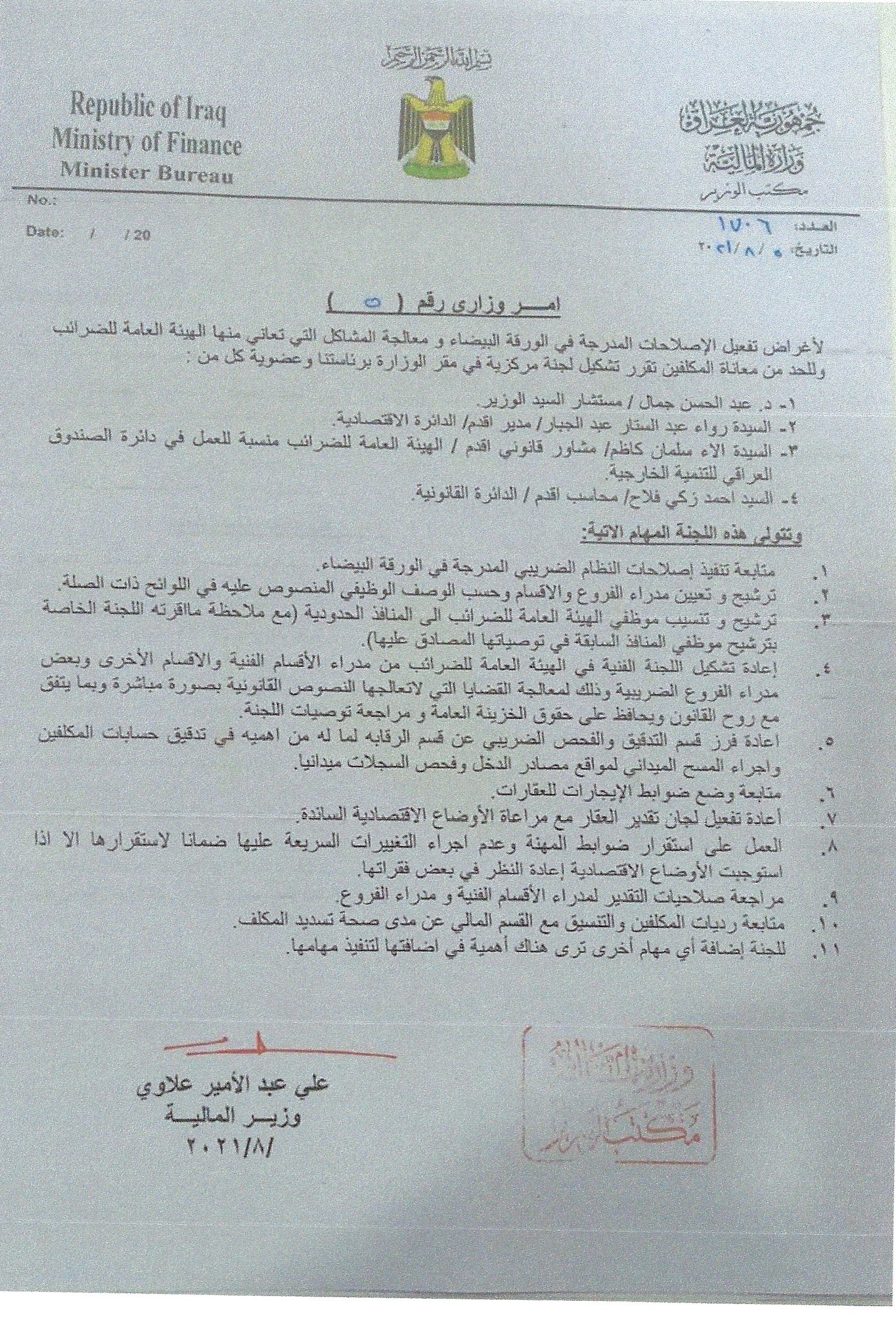 ثالثا: ولضمان عدم التلاعب في الامانات الضریبیة أصدر وزیر المالیة بتاریخ ٥ اب ٢٠٢١ امر وزاري رقم )٥( قرر فیھ تشكیل لجنة مركزیة وزاریة برئاستھ لغرض تنظیم والاشراف على مھام عمل الضرائب بما في ذلك بمتابعة ردیات المكلفین والتنسیق مع القسم المالي عن مدى صحة تسدید المكلف.