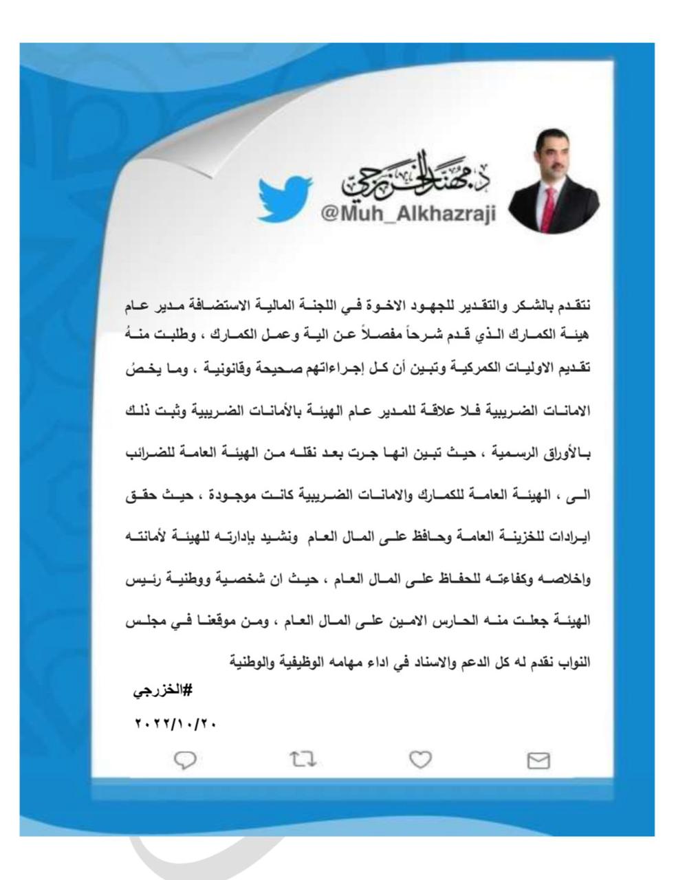 محلياتالنائب مهند الخزرجي: الاوراق الرسمية اثبتت عدم وجود علاقة لمدير الكمارك بالامانات الضريبية قبل 3 سنوات 7 مشاهدات شارك الوسومالكماركاللجنة المالية النيابيةقد يهمك أيضا رياضة قائد السودان قبل مواجهة العراق: نتجاوز فواجع الحرب بكرة القدم والفوز "يوم عيد" قبل 29 دقيقة 3 مشاهدات علوم وتكنولوجيا خلل فني يوقف عمل منصات ومواقع عالمية على الإنترنت قبل 54 دقيقة 7 مشاهدات عربي ودولي نعيم قاسم: ننتظر من الحكومة اللبنانية أن تبين لنا بطولاتها بإيقاف العدوان وتحرير الأسرى والإعمار قبل ساعة واحدة 7 مشاهدات رياضة أخطاء كارثية وكرات ساخنة.. كوابيس الماضي تحاصر قرعة كأس العالم قبل ساعة واحدة 6 مشاهدات عربي ودولي حماس: وافقنا على تشكيل لجنة تكنوقراط لحكم غزة قبل ساعة واحدة 11 مشاهدات
