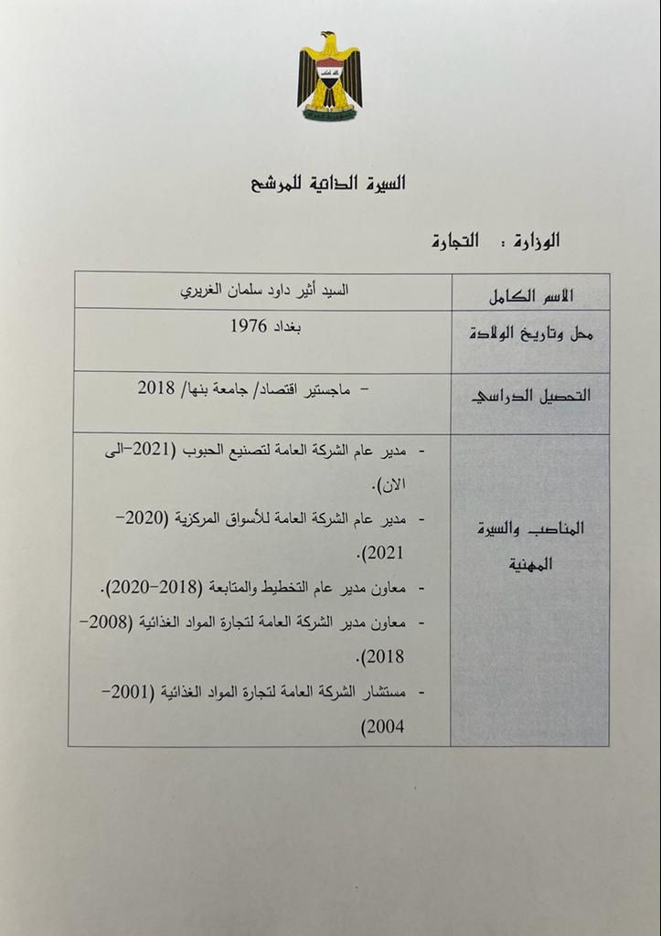 سياسةالرشيد تنشر السير الذاتية لمرشحي وزارات الزراعة – الصناعة – التجارة قبل 3 سنوات 3 مشاهدات شارك الوسوممحمد شياع السودانيقد يهمك أيضا أمن مقتل شاب برصاصة أطلقها منتسب أمني بالخطأ خلال "مشاجرة اعتيادية" في أبي غريب غربي بغداد قبل ساعتين 7 مشاهدات رياضة مدرب الأرجنتين معلقاً على قرعة المونديال: منتخب الجزائر قوي والأردن مجهول بالنسبة لي قبل ساعتين 14 مشاهدات محليات العراق يستقبل موجة أمطار غزيرة.. الأنواء تحذر من سيول وفيضانات في المناطق غير المخدومة اعتباراً من الغد قبل 3 ساعات 16 مشاهدات محليات المالية تنفي استقبال نائبة للتفاوض مع وزيرتها بشأن مستحقات المقاولين قبل 3 ساعات 10 مشاهدات عربي ودولي البيت الأبيض يحذر: أوروبا مهددة بـ"زوال الحضارة" خلال 20 عاماً قبل 3 ساعات 9 مشاهدات