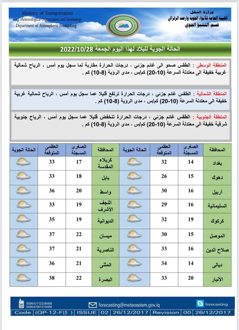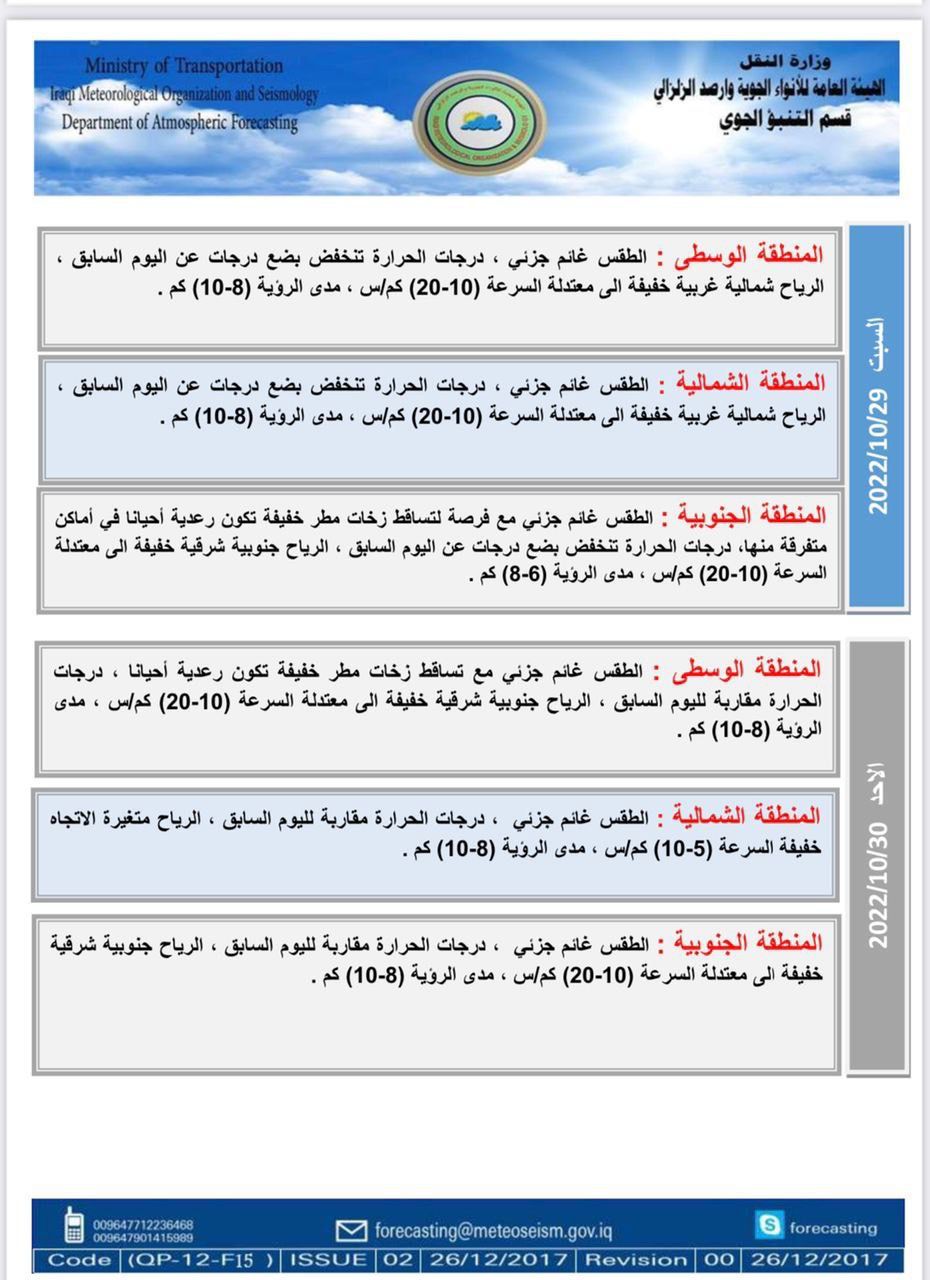 أعلنت هيئة الأنواء الجوية، توقعاتها لحالة الطقس خلال الأيام المقبلة، فيما أشارت إلى انخفاض بدرجات الحرارة وأمطار خفيفة خلال الأيام المقبلة.