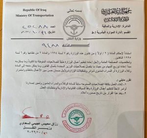 وبحسب وثيقة حصلت عليها “الرشيد”، جاء فيها، انه “استناداً لأحكام المادة (2/ أولاً) من قانون وزارة النقل رقم 7 لسنة 1994 والمادة 2 من نظامها رقم 6 لسنة 1995 النافذين، لمقتضيات المصلحة العامة ولأجل إعادة تنظيم أعمال الوزارة طبقاً للصلاحيات المنوطة بنا قانوناً وما يستلزمه مبدأ إعادة توزيع المهام من حيث ما يتصل بصلاحيات الوزير المحددة بأصل القانون وما يمكن منحه إلى وكلاء الوزارة أو المدراء العامون في دوائر وتشكيلات الوزارة ولأجل ضمان حسن سير الأعمال بانتظام واستمرار، تقرر: إلغاء العمل بكافة الصلاحيات الممنوحة سابقاً للوكلاء والمدراء العامون ولحين إصدارنا أوامر لاحقاً بتنظيم أعمال الوزارة وفقاً للسياقات القانونية والإدارية ومتطلبات العمل”.