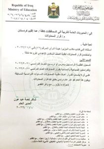 – شمول الطلبة الراسبين بدرس أو درسين للعام الدراسي 2021 – 2022 ، وللدراستين الصباحية والمسائية بقرار المحاولات للعام الدراسي 2022 – 2023 ، على ان لا يشمل القرار أعلاه طلبة المحاولات للسنوات الدراسية السابقة ، ويكون هذا العام هو آخر عامٍ دراسي يُطبق فيه قرار المحاولات.