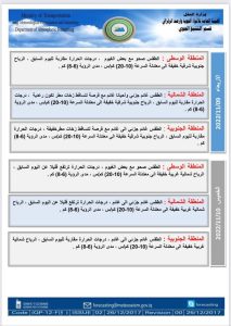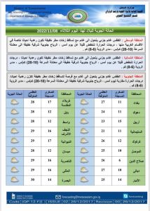 أعلنت هيئة الأنواء الجوية، اليوم الثلاثاء، عن حالة الطقس في البلاد للأسبوع الحالي، فيما توقعت هطول أمطاراً رعدية وانخفاضاً في درجات الحرارة.