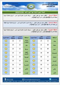 أعلنت هيئة الأنواء الجوية، اليوم الاحد، عن حالة الطقس في البلاد للأسبوع الحالي، فيما توقعت تساقطاً للأمطار وانخفاضاً في درجات الحرارة.