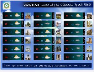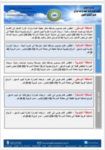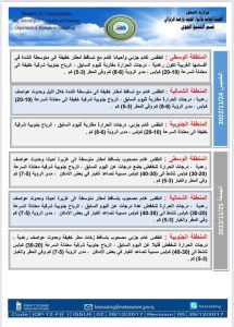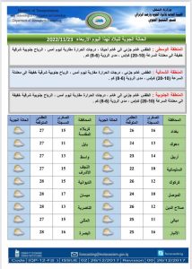 أعلنت هيئة الأنواء الجوية، اليوم الأربعاء، عن حالة الطقس في البلاد للأيام المقبلة، فيما توقعت تساقطاً للأمطار وحدوث عواصف رعدية بدءاً من الغد.