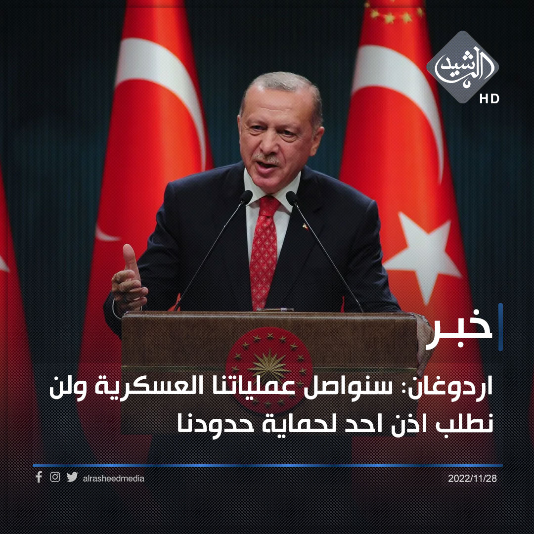 أكد الرئيس التركي رجب طيب أردوغان أن تركيا ستواصل عمليتها العسكرية ضد الفصائل المسلحة الكردية حتى "القضاء على آخر إرهابي"، مضيفا أن أنقرة لن تطلب إذنا من أحد "لحماية حدودها".