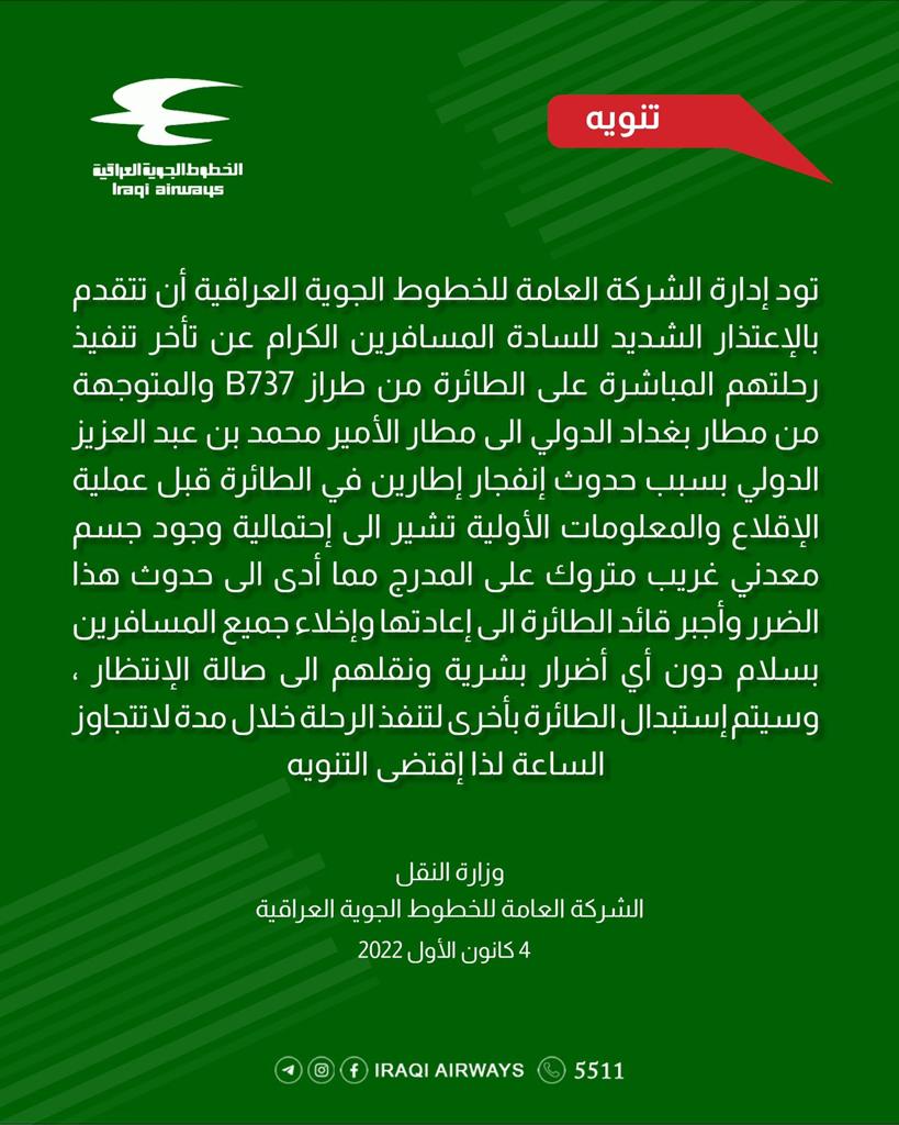 محلياتالخطوط الجوية: جسم معدني متروك على المدرج بمطار بغداد تسبب بانفجار اطارين باحدى الطائرات قبل 3 سنوات 5 مشاهدات شارك الوسوممطار بغداد الدوليقد يهمك أيضا عربي ودولي وزير الدفاع الإسرائيلي: لن نسمح بأي تهديد إيراني ولن ننسحب من جبل الشيخ قبل 19 دقيقة 4 مشاهدات سياسة القاضي فائق زيدان: استقلال القضاء هو حجر الزاوية في أي نظام ديمقراطي حقيقي قبل ساعة واحدة 5 مشاهدات سياسة رئيس مجلس القضاء: محكمة التمييز تمثل قمة الهرم القضائي ورمزاً للاستقرار القانوني في العراق قبل ساعة واحدة 6 مشاهدات أمن عمليات بغداد تعيد فتح طريق مغلق بمنطقة العرصات وسط العاصمة قبل ساعتين 6 مشاهدات محليات الداخلية: إيقاف العمل في مديرية الأحوال المدنية والجوازات والإقامة حتى 4 كانون الثاني 2026 قبل 3 ساعات 13 مشاهدات