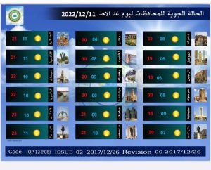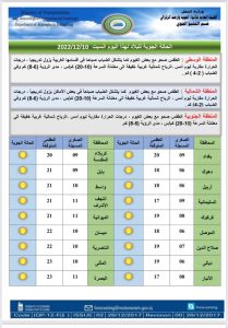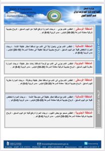أعلنت هيئة الأنواء الجوية، اليوم الجمعة، عن حالة الطقس في البلاد للأيام المقبلة، فيما توقعت أمطاراً وارتفاعاً في درجات الحرارة.