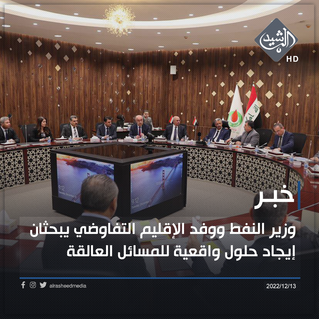 وذكر بيان للوزارة تلقته الرشيد، أن “نائب رئيس الوزراء لشؤون الطاقة وزير النفط حيان عبد الغني استقبل وفد الإقليم التفاوضي برئاسة وزير المالية أوات شيخ جناب، وعضوية كل من: وزير الثروات الطبيعية وكالة كمال محمد، ورئيس ديوان مجلس وزراء الإقليم أوميد صباح، ورئيس ممثلية حكومة الإقليم في بغداد والمتحدث باسم حكومة الإقليم، بالإضافة الى عدد من المستشارين في وزارة الثروات الطبيعية”.