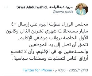 أقتصادسروة عبد الواحد: مجلس الوزراء صوَّت اليوم على إرسال 400 مليار دينار لاقليم كردستان قبل 3 سنوات 6 مشاهدات شارك الوسومسروة عبد الواحدكردستانمجلس الوزراءقد يهمك أيضا أمن مقتل شاب برصاصة أطلقها منتسب أمني بالخطأ خلال "مشاجرة اعتيادية" في أبي غريب غربي بغداد قبل 3 ساعات 8 مشاهدات رياضة مدرب الأرجنتين معلقاً على قرعة المونديال: منتخب الجزائر قوي والأردن مجهول بالنسبة لي قبل 3 ساعات 16 مشاهدات محليات العراق يستقبل موجة أمطار غزيرة.. الأنواء تحذر من سيول وفيضانات في المناطق غير المخدومة اعتباراً من الغد قبل 3 ساعات 16 مشاهدات محليات المالية تنفي استقبال نائبة للتفاوض مع وزيرتها بشأن مستحقات المقاولين قبل 4 ساعات 10 مشاهدات عربي ودولي البيت الأبيض يحذر: أوروبا مهددة بـ"زوال الحضارة" خلال 20 عاماً قبل 4 ساعات 9 مشاهدات
