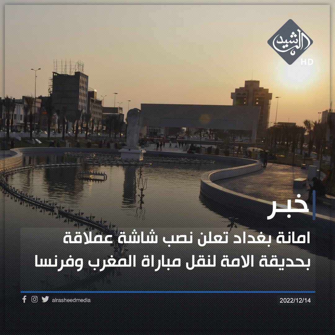 اعلنت امانة بغداد، اليوم الاربعاء، قيامها بنصب شاشة تلفزيونية عملاقة في حديقة الامة وسط العاصمة لنقل مباراة المغرب وفرنسا في كأس العالم.
