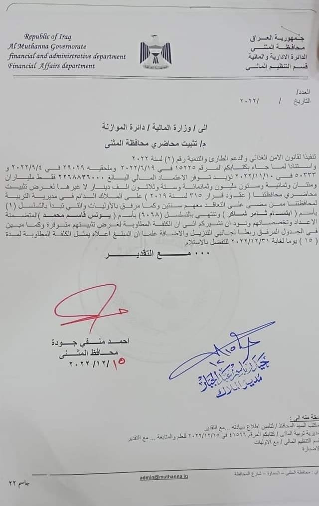 صادق محافظ المثنى أحمد منفي جودة، على الكلف المالية الخاصة بالمحاضرين والإداريين استعدادا لتثبيتهم.