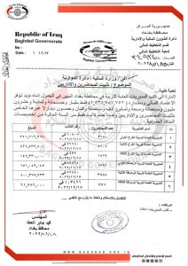 وذكر بيان للمحافظة تلقته الرشيد، أن “محافظ بغداد محمد جابر العطا فاتح دائرة الموازنة في وزارة المالية، يؤيد فيه توفر الإعتماد المالي، لتثبيت المحاضرين لمن له خدمة سنتين أو أكثر في مديريات التربية”.