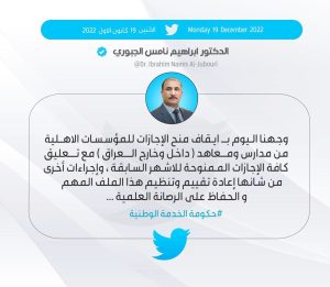 وقال الجبوري، في تغريدة على تويتر تابعتها “الرشيد”، “وجهنا اليوم بايقاف منح الإجازات للمؤسسات الأهلية من مدارس ومعاهد داخل وخارج العراق”.