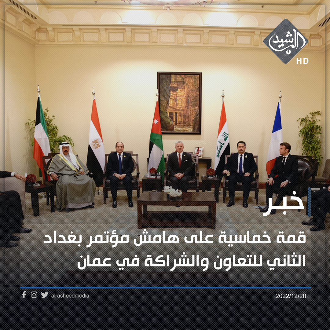 رئيس مجلس الوزراء محمد شياع السوداني يترأس وفد العراق في قمة خماسية ضمت العراق والأردن ومصر والكويت وفرنسا، عقدت على هامش مؤتمر بغداد الثاني للتعاون والشراكة الذي تستضيفه المملكة الأردنية الهاشمية.