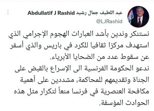 وقال رئيس الجمهورية في تغريدة له: “نستنكر وندين بأشد العبارات الهجوم الإجرامي الذي استهدف مركزاً ثقافياً للكرد في باريس والذي أسفر عن سقوط عدد من الضحايا الأبرياء”.