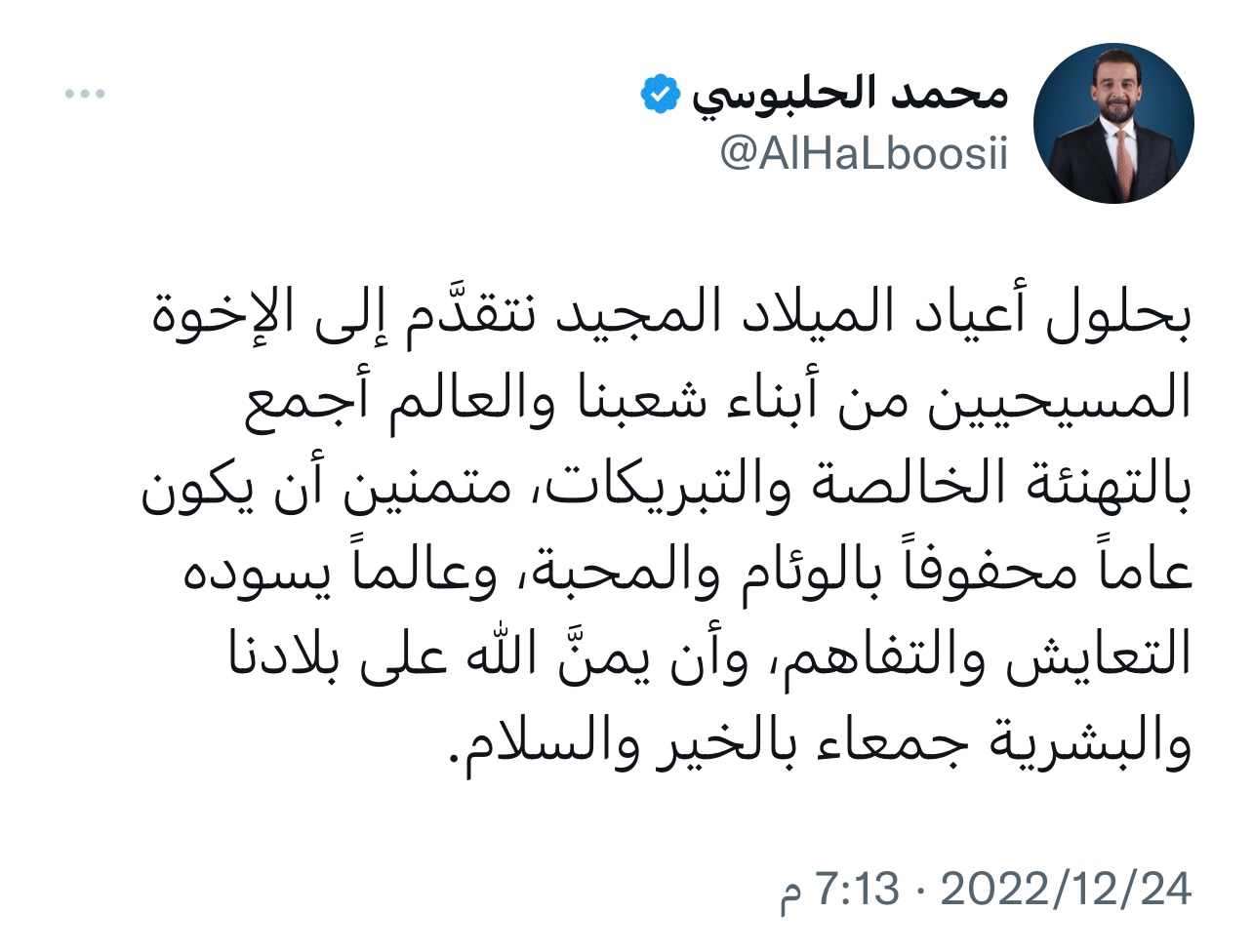 سياسةالحلبوسي يهنئ المسيحيين بأعياد الميلاد المجيد قبل 3 سنوات 3 مشاهدات شارك الوسومالحلبوسيمسيحيو العراقمولد السيد المسيحقد يهمك أيضا محليات العراق يستقبل موجة أمطار غزيرة.. الأنواء تحذر من سيول وفيضانات في المناطق غير المخدومة اعتباراً من الغد قبل 8 دقائق 2 مشاهدات محليات المالية تنفي استقبال نائبة للتفاوض مع وزيرتها بشأن مستحقات المقاولين قبل 34 دقيقة 9 مشاهدات عربي ودولي البيت الأبيض يحذر: أوروبا مهددة بـ"زوال الحضارة" خلال 20 عاماً قبل 39 دقيقة 8 مشاهدات عربي ودولي دول عربية وإسلامية تعلن رفضها لتصريحات إسرائيل بشأن فتح معبر رفح باتجاه واحد قبل ساعة واحدة 7 مشاهدات رياضة المنتخبات العربية في مجموعات صعبة.. الرشيد تنشر القرعة الكاملة للمونديال قبل ساعة واحدة 8 مشاهدات