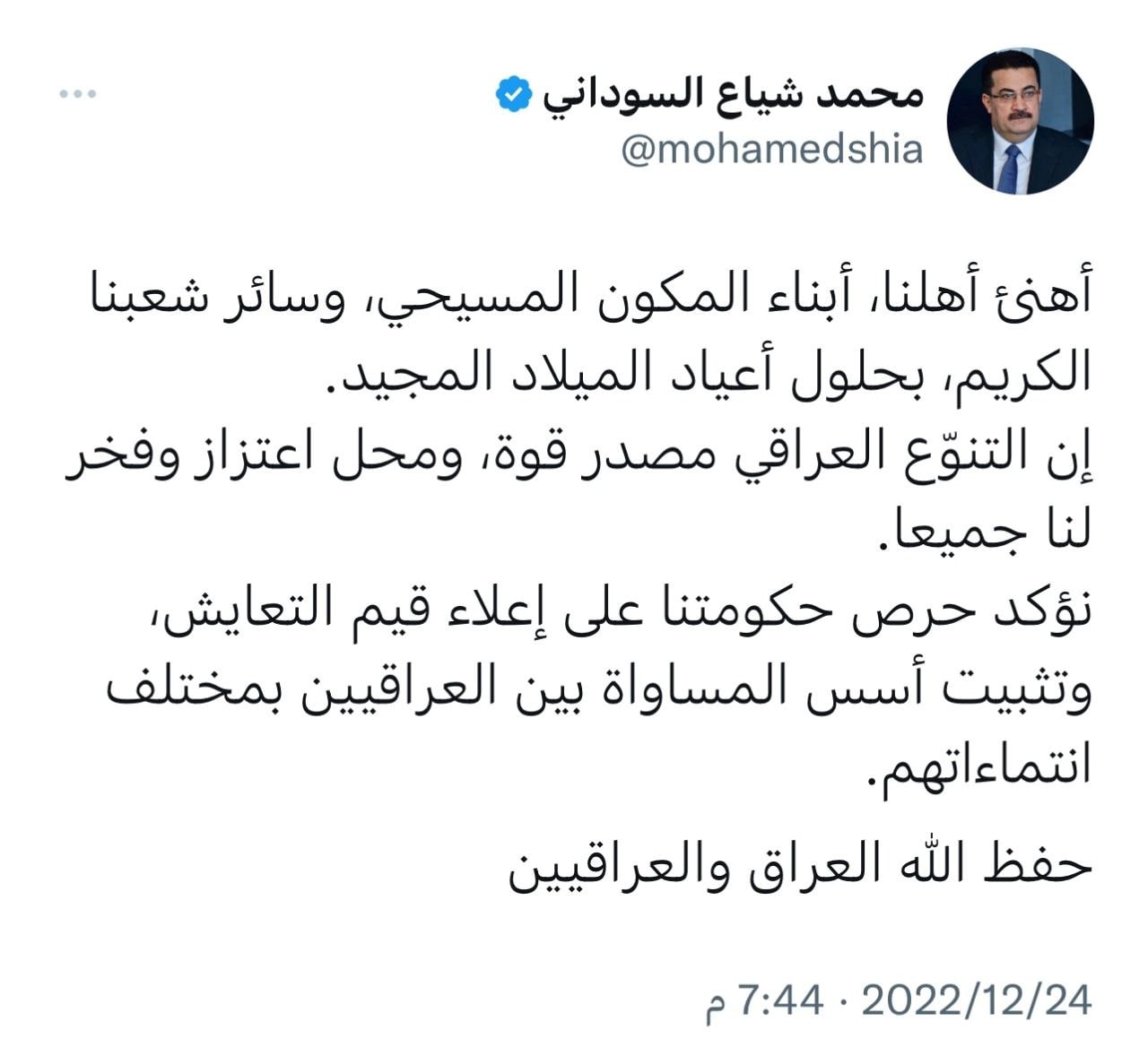 سياسةالسوداني يهنئ المسيحيين باعياد الميلاد المجيد: نحرص على إعلاء قيم التعايش قبل 3 سنوات 1 مشاهدة شارك الوسوممحمد شياع السودانيمسيحيو العراقمولد السيد المسيحقد يهمك أيضا عربي ودولي موسكو: قد يتم عقد لقاء بين بوتين وترامب في القريب العاجل قبل 39 دقيقة 5 مشاهدات رياضة "توالي الأزمات".. ليفربول يوجه ضربة قوية لمحمد صلاح ويقرر بيعه قبل ساعة واحدة 7 مشاهدات عربي ودولي الرئيس اللبناني يطالب مجلس الأمن بالضغط على إسرائيل لتطبيق وقف إطلاق النار قبل ساعة واحدة 8 مشاهدات محليات العدل تعلن إطلاق سراح 761 نزيلاً خلال تشرين الثاني قبل ساعتين 11 مشاهدات عربي ودولي ارتفاع عدد ضحايا الفيضانات والانهيارات الأرضية في إندونيسيا إلى 846 قبل ساعتين 12 مشاهدات
