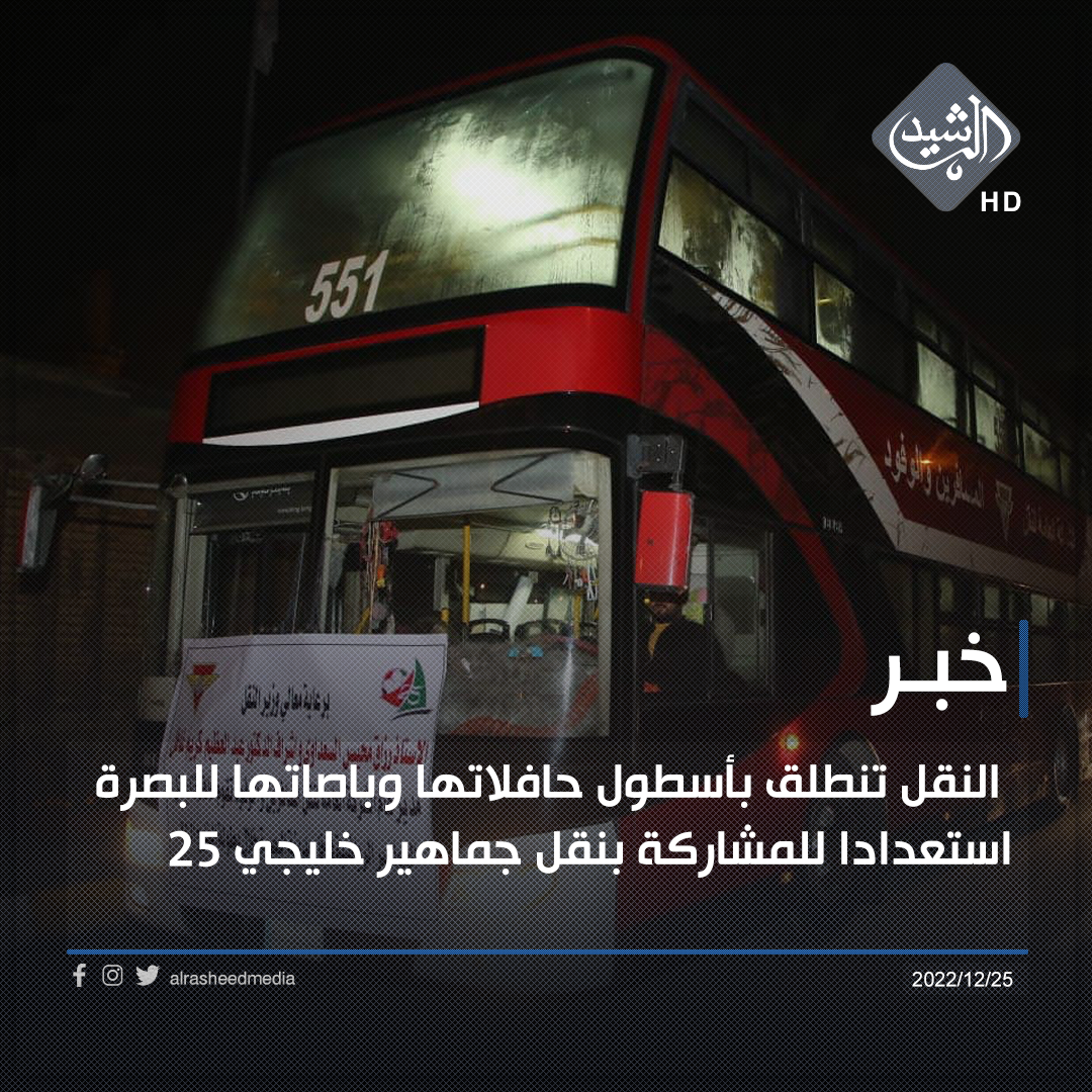 أعلنت الشركة العامة للوفود والمسافرين أحد تشكيلات وزارة النقل، الأحد، تسيير أسطول حافلات إلى محافظة البصرة، للمشاركة بنقل وخدمة جماهير بطولة خليجي 25 التي ستقام في مطلع العام 2023.