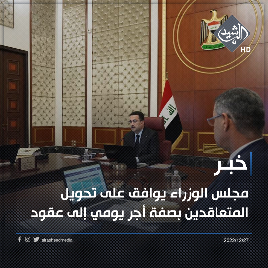 وفي السياق ذاته وافق مجلس الوزراء على تحويل المتعاقدين بصفة أجر يومي على وفق قرار مجلس الوزراء (192 لسنة2021) الى عقود، وفقاً لقراري مجلس الوزراء (315 و337 لسنة 2019) للتشكيلات العائدة الى وزارة النفط بحسب الجداول المرافقة ربط كتاب وزارة المالية المرقم بالعدد (11702)، المؤرخ في 18 كانون الأول2022، وتأمين مستحقاتهم المالية ضمن تخصيصات موازناتهم التخطيطية لسنة 2022، استناداً الى أحكام المادة (45/خامساً/أ) من قانون الإدارة المالية الاتحادية (6 لسنة 2019) المعدّل.