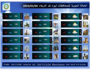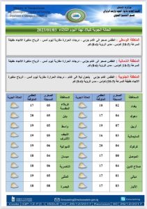 أعلنت هيئة الأنواء الجوية، اليوم الثلاثاء، عن حالة الطقس في البلاد للأيام المقبلة، فيما توقعت ارتفاعاً في درجات الحرارة بدءاً من الجمعة.