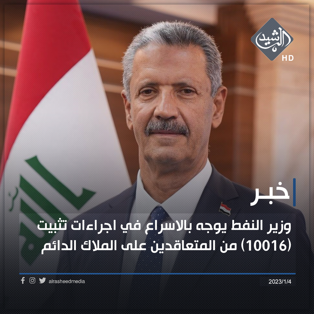 وذكر بيان للوزارة تلقته “الرشيد”، إن “وزيرها وجه الشركات النفطية والدوائر المعنية في الوزارة بالإسراع في إجراءات تثبيت (10016) من المتعاقدين على ملاك الشركات النفطية في شركة نفط ذي قار وشركة خطوط الأنابيب وشركة الاستكشافات، وشركة مصافي الوسط، وشركة تسويق النفط، وشركة المشاريع وشركة نفط ميسان وشركة نفط البصرة”.