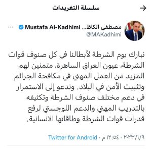 سياسةالكاظمي يبارك بذكرى تأسيس الشرطة العراقية ويدعو إلى الاستمرار بدعم مختلف صنوفها قبل 3 سنوات 3 مشاهدات شارك الوسومالكاظميقد يهمك أيضا سياسة المجلس السياسي الوطني يعلن الاتفاق على آليات تسهل حسم اختيار رئيس مجلس النواب قبل 5 ساعات 10 مشاهدات الحكم الرابع الـVAR يتلاعب بدورينا .. تفاصيل صادمة في الحكم الرابع قبل 5 ساعات 10 مشاهدات عربي ودولي الحكومة الليبية تعلن مقتل رئيس الأركان محمد الحداد ومرافقيه اثر تحطم طائرتهم في أنقرة قبل 5 ساعات 19 مشاهدات عربي ودولي مقتل رئيس الأركان الليبي "محمد الحداد" ومرافقيه بتحطم طائرتهم أثناء عودتهم من أنقرة قبل 5 ساعات 16 مشاهدات عربي ودولي وسائل إعلام تركية: العثور على حطام طائرة رئيس الاركان الليبي التي سقطت بعد إقلاعها من أنقرة قبل 5 ساعات 9 مشاهدات