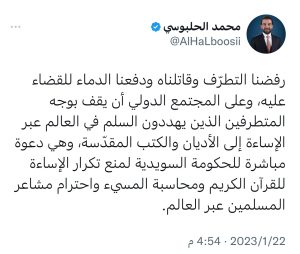 سياسةالحلبوسي يدعو الحكومة السويدية لمنع تكرار الاساءة للقرآن الكريم قبل 3 سنوات 5 مشاهدات شارك الوسومالحكومة السويديةالحلبوسيالقرآن الكريمقد يهمك أيضا رياضة أخطاء كارثية وكرات ساخنة.. كوابيس الماضي تحاصر قرعة كأس العالم قبل 9 دقائق 3 مشاهدات عربي ودولي حماس: وافقنا على تشكيل لجنة تكنوقراط لحكم غزة قبل 20 دقيقة 4 مشاهدات رياضة عرض سعودي ضخم لضم رافينيا يربك حسابات برشلونة قبل 24 دقيقة 4 مشاهدات محليات الصحة: نصف النزلاء في مستشفى الرشاد متماثلون للشفاء لكن ذويهم يرفضون استلامهم قبل 50 دقيقة 8 مشاهدات عربي ودولي مقربون يكشفون: بشار الأسد تأقلم واستسلم للمنفى وشقيقه ماهر لم يتقبل فكرة فقدان السلطة قبل 54 دقيقة 9 مشاهدات