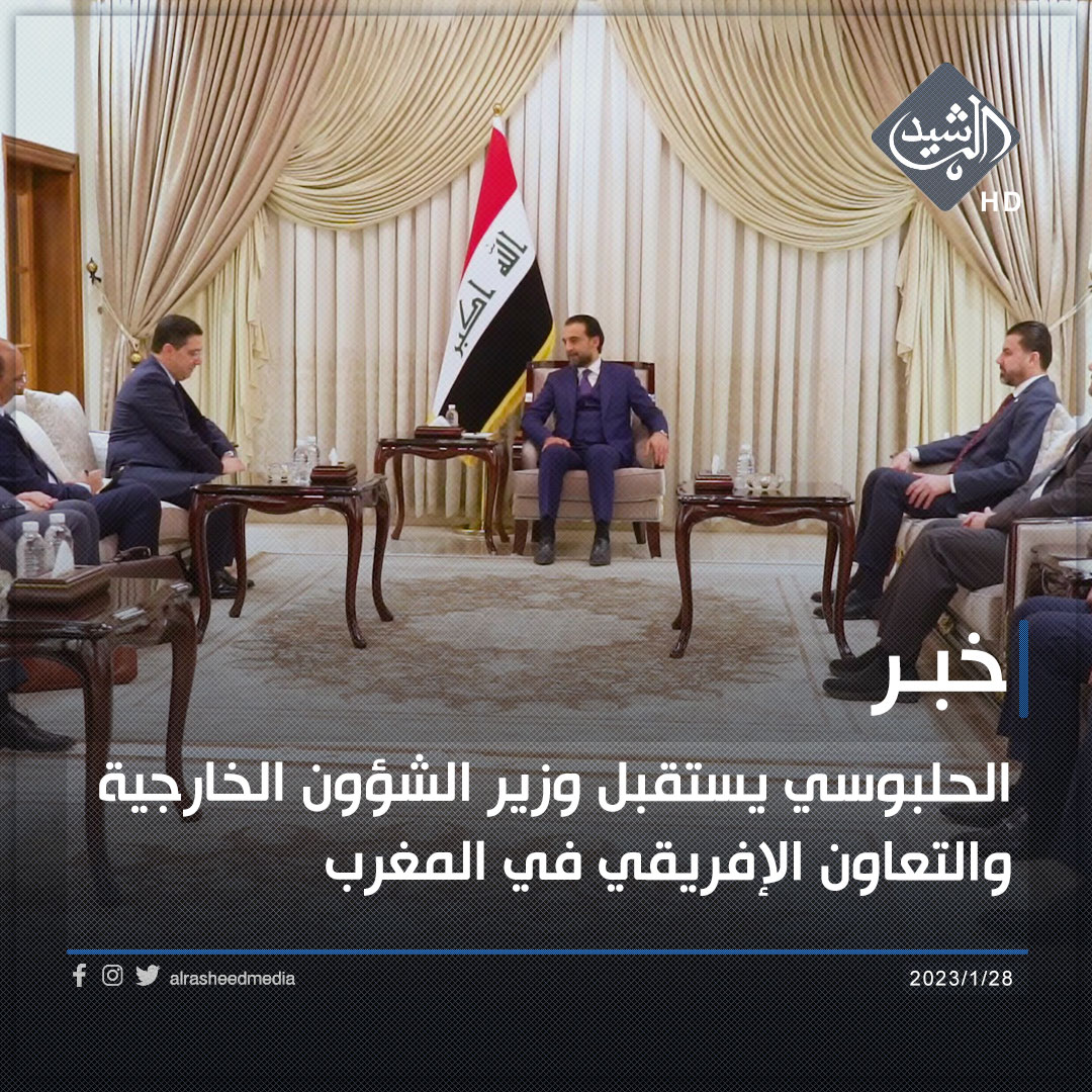 وذكر المكتب الاعلامي للحلبوسي، في بيان تلقته الرشيد”، ان “رئيس مجلس النواب محمد الحلبوسي، استقبل اليوم السبت، وزير الشؤون الخارجية والتعاون الإفريقي في المملكة المغربية ناصر بوريطة والوفد المرافق له”.