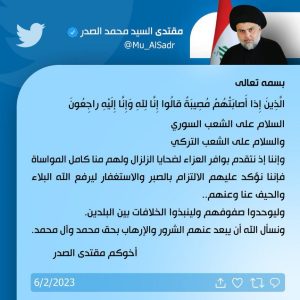 سياسةالسيد الصدر يعزي الشعبين السوري والتركي بضحايا الزلزال: لينبذوا الخلافات بين البلدين قبل 3 سنوات 7 مشاهدات شارك الوسومالصدرقد يهمك أيضا عربي ودولي مجلس الشيوخ الأمريكي يصوت لصالح إلغاء عقوبات قانون قيصر عن سوريا قبل 9 دقائق 2 مشاهدات أمن أمن كردستان يعتقل مخمورًا قام بالاعتداء على مقابر المسيحيين في شقلاوة بمحافظة أربيل قبل 55 دقيقة 6 مشاهدات محليات بابل تقرر تعطيل الدوام الرسمي ليوم غدٍ الخميس بسبب سوء الاحوال الجوية قبل ساعة واحدة 14 مشاهدات محليات ذي قار تعلن تعطيل الدوام في المدارس فقط يوم غدٍ الخميس بسبب سوء الأحوال الجوية قبل ساعتين 11 مشاهدات أمن وزارة الدفاع تنفي وقوع انفجارات داخل قاعدة الشهيد محمد علاء الجوية قبل ساعتين 6 مشاهدات